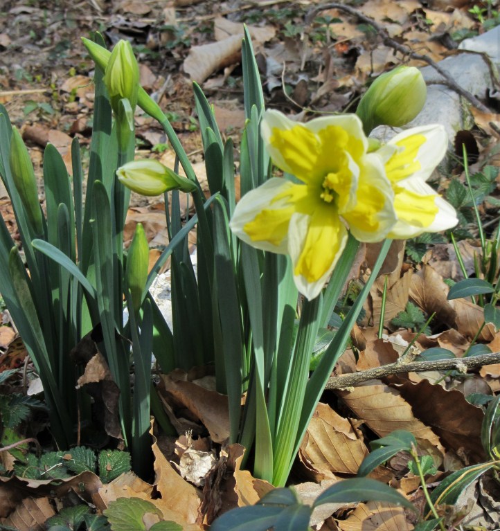 Our next door neighbors, an English couple, also love daffies and plant a fresh lot of bulbs each fall to add to their springtime display. Daffodils are heirloom plants, blooming for many decades after they are planted. They divide each summer and sometimes their seeds are spread around, allowing for natural hybrids and unpredictable spread. Their bright yellows, whites and golds light up our woodlands before the first buds of Forsythia or wild deerberries begin their bloom.