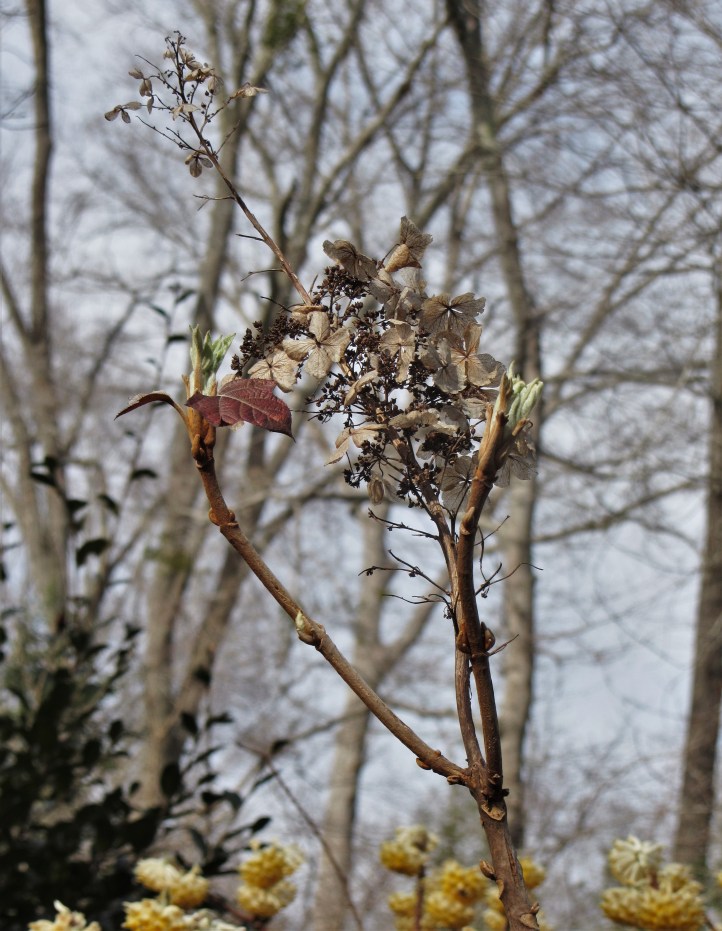 When I started buying plants for my own yard, in the mid 1980s, Autumn Olive was a hot item because it supports pollinators, feeds birds, is tough and persistent. Every catalog promoted them. Now, we have learned how invasive they can become, crowding out other species. I had some appear (volunteers) in a border in this garden. I left them alone for a few years to see what they would do. Then I began pruning hard every spring to control their rampant growth. I just cut two of them back to about 4″ tall, and will do that with any others I notice this spring. Yes, they feed pollinators. But I’m going to favor the native Vacciniums cropping up in the garden and control the Elaeagnus, because they are aggressive. Sometimes flowers with the most nutritious pollen and nectar are the least impressive to the human eye. My solution is to grow a dense garden, with lots of plants, and hope that lots of different species can find what they need here to thrive. But thoughtful editing is essential.