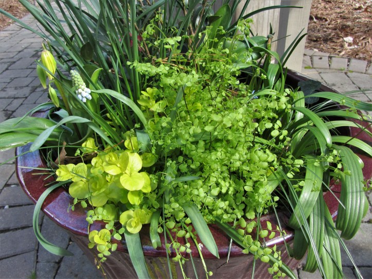 Southern Maidenhair Fern, Adiantum capillus-veneris, emerges with spring bulbs in this planter at the Williamsburg Botanical Garden