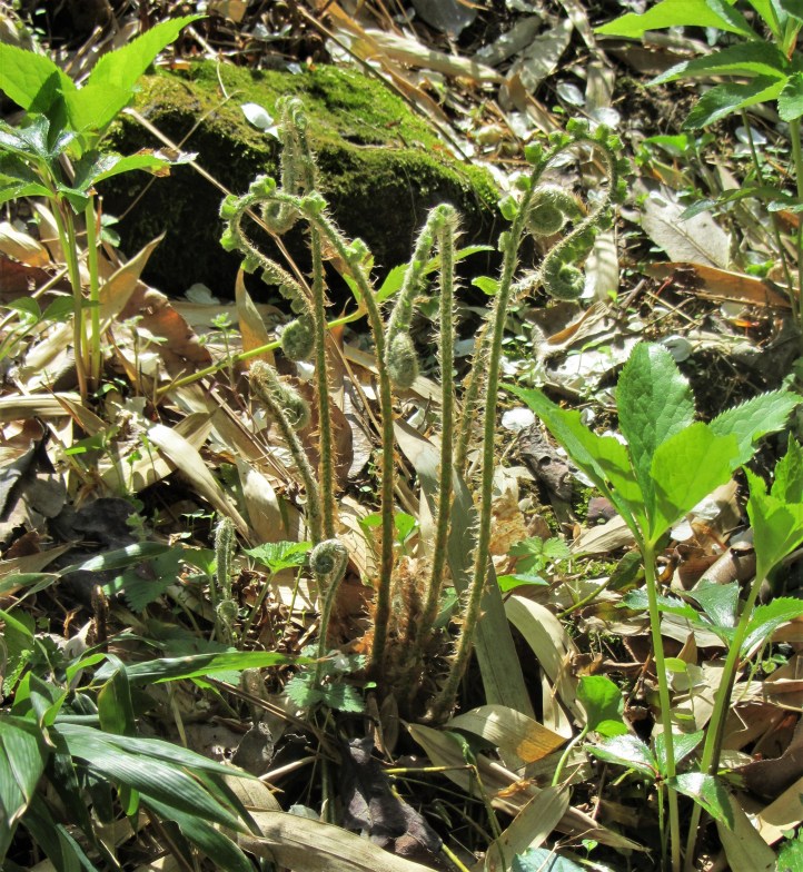 It started this week.  Not to be missed while mesmerized by daffodils and apple blossoms, the first tightly wound fronds emerged from the wet, warming earth and began to unfurl.
