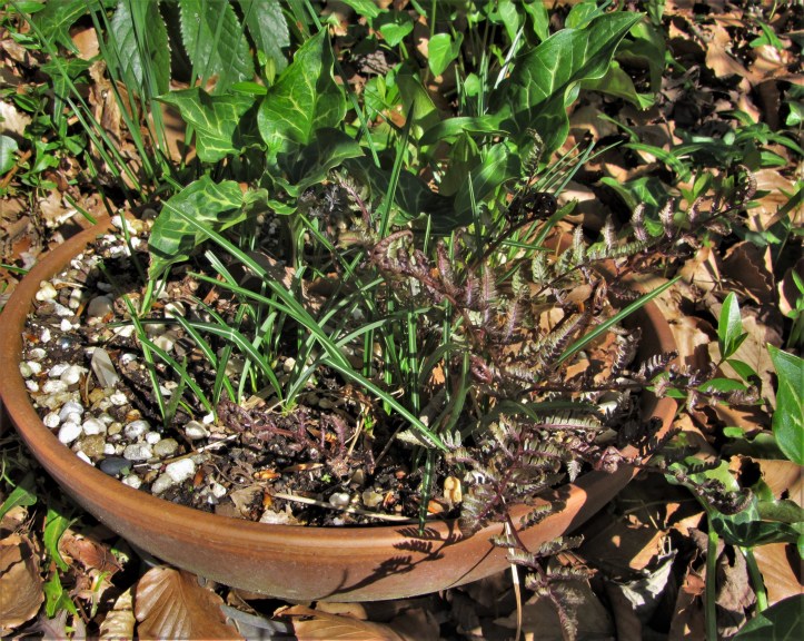 This spring I’m learning more about our native Aspleniums.  I’ve had Ebony Spleenwort around for several years now.  I rescued some that sprouted in the folds of Juniper branches, in the sun, and appeared to be growing out of the shrubs.  They have few demands, but most species in this group prefer more calcareous soils than we have in our area. That is an easy fix for a potted plant or ones grown in a raised bed.