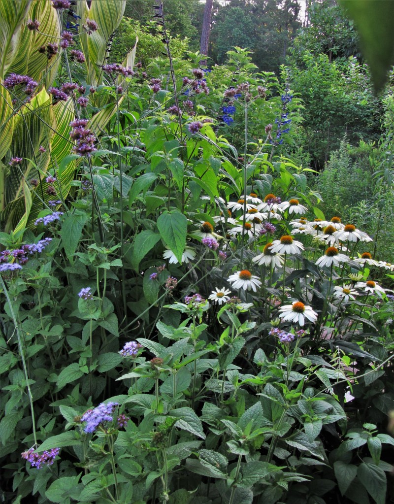 Canna lilies tower over Verbena bonariensis, Salvias and other flowers hummingbirds enjoy. Williamsburg Botanical Garden