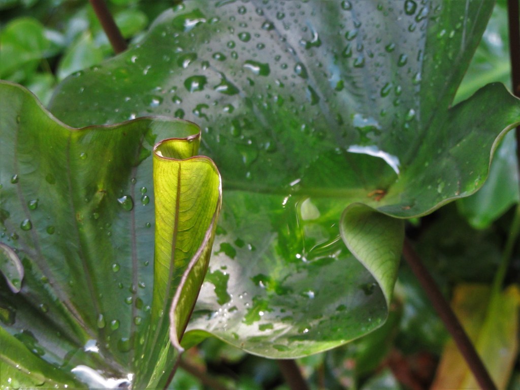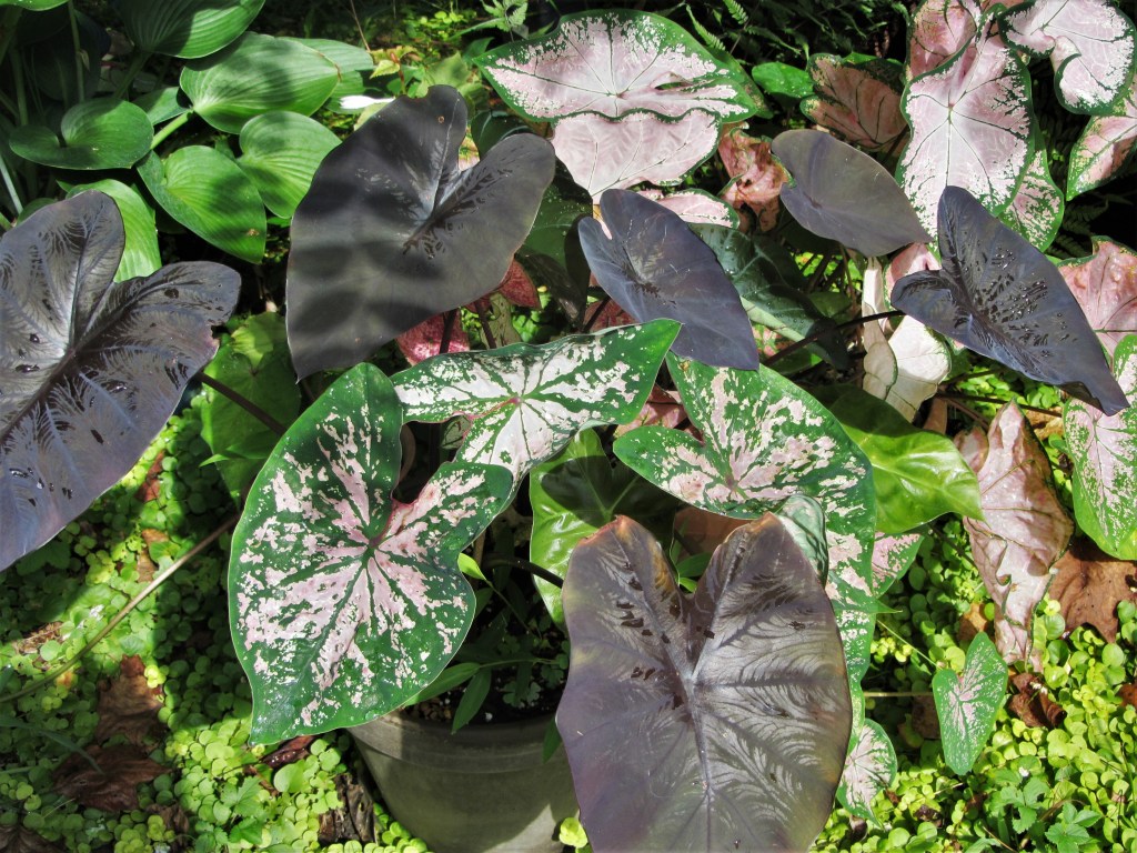 We dig all of the tender Caladiums and other geophytes, dry and store them; or bring their pots indoors; before Thanksgiving. I water our Alocasias and Colocasias lightly through the winter, where they continue to send up leaves in the living room, garage or basement.