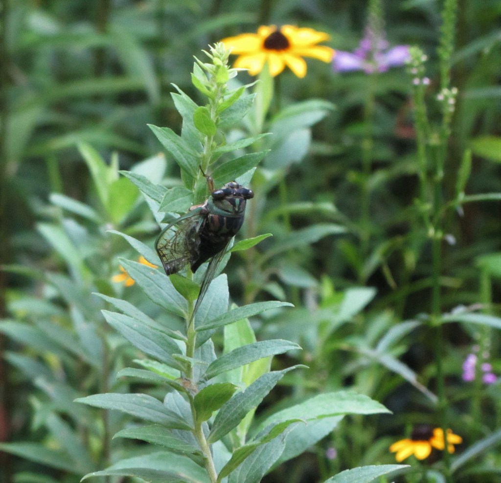 The short glimpse we got of this creature in motion told us it was a very large insect rather than a very small bird. It was probably a cicada, based on its sound and size. Had we not come close enough to find it when we did, or had we not helped it break free, it would have been a fine meal for a spider. These dramas play out continually in the garden.
