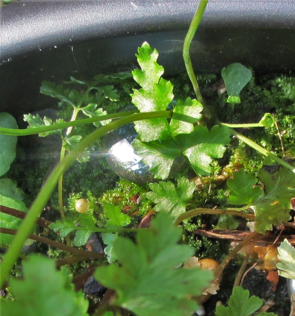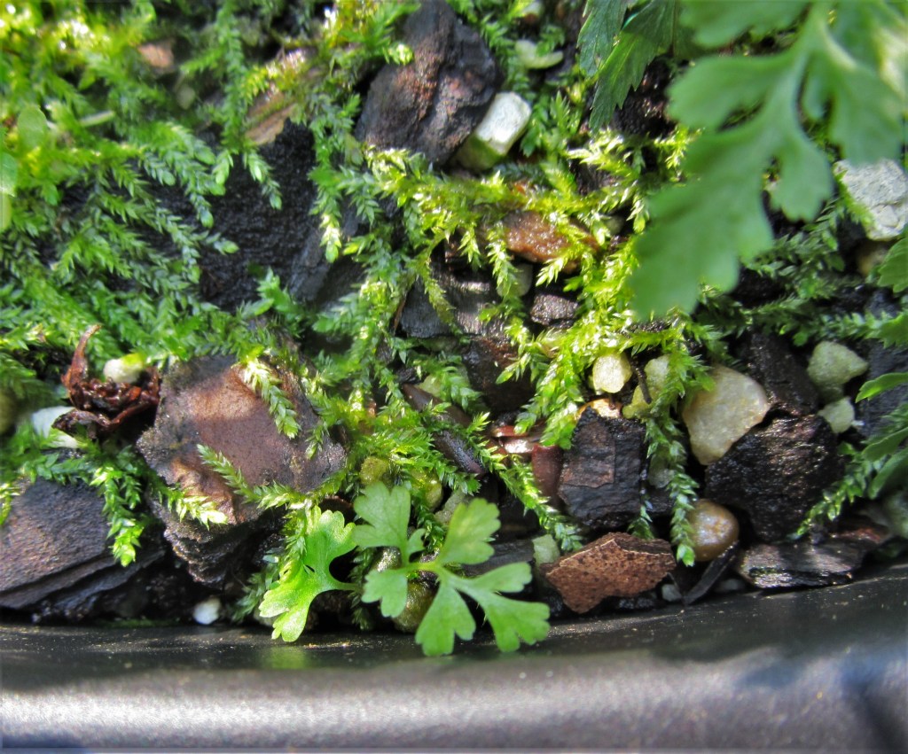 I’ve been lifting these baby ‘sporeling’ ferns from mosses in the yard, and from the plastic box where this all unfolded this spring quite accidentally, and then planting them into pots on the deck and around the garden. I used a few in fern tables I’ve built this summer, and I’ve given a few as gifts. Growing my own ferns is much like the luxury of growing one’s own summer tomatoes. Such a pleasure to raise them at home and not need to run to the store for every fresh tomato sandwich- or each new fern included in a potted arrangement.