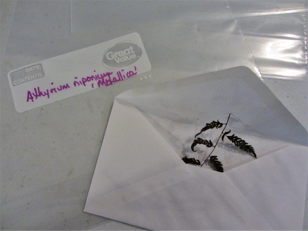 Some gardeners suggest you collect fertile fronds in paper lunch bags. Others tell you to lay a frond on a piece of typing paper to dry. The method I’ve adopted, as described in the HFF booklet, suggests putting a clipping of a few pinnules from a ripe fertile frond into an envelope. It is easy enough to note the type of fern collected and the date on the envelope, and then seal it up until the frond has dried and dropped its spore. Sowing the released spore from the envelope is easy, too. I’ve been resealing the envelopes to allow more spore to collect for a later sowing, or even to share. Depending on the genus, spore may remain viable for a few days or a few years.