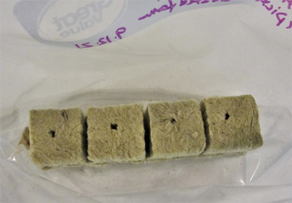 I liked Dr. Peter Podaras’s procedure in which he sowed spore directly onto either floral Oasis foam or rockwool. Since rockwool is sold for propagation of seeds and cuttings, I am going to assume it is already sterile enough for spores. I cut blocks of rockwool to fit the bottom of gallon sized zip-lock bags.