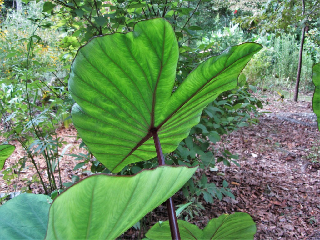 Which brings me back to elephant ears.  By early autumn, they have come into the height of their beauty.  They thrive in heat and humidity.  Their bold leaves and bright colors bring me joy.  There is nothing ‘native’ about the bold Caladiums, Colocasias and Alocasias I crave, and maybe that gives them a bit of protection from the critters that would otherwise eat them.