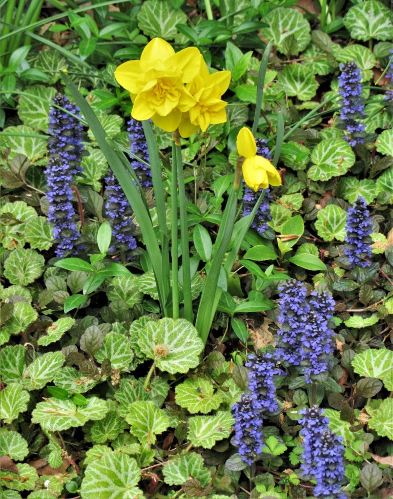 Brilliant lavender-blue flowers cover each 5”-6” stem with nectar rich flowers, attractive to pollinating insects and hummingbirds. Like other members of the mint, or Lamiaceae family, Ajuga flowers nourish native bees and other pollinators over a long season. No maintenance is required, but a string trimmer makes short work of cutting back the stems once flowers have faded and prevents reseeding. Ajuga makes a stunning combination with Narcissus and other spring flowering bulbs.