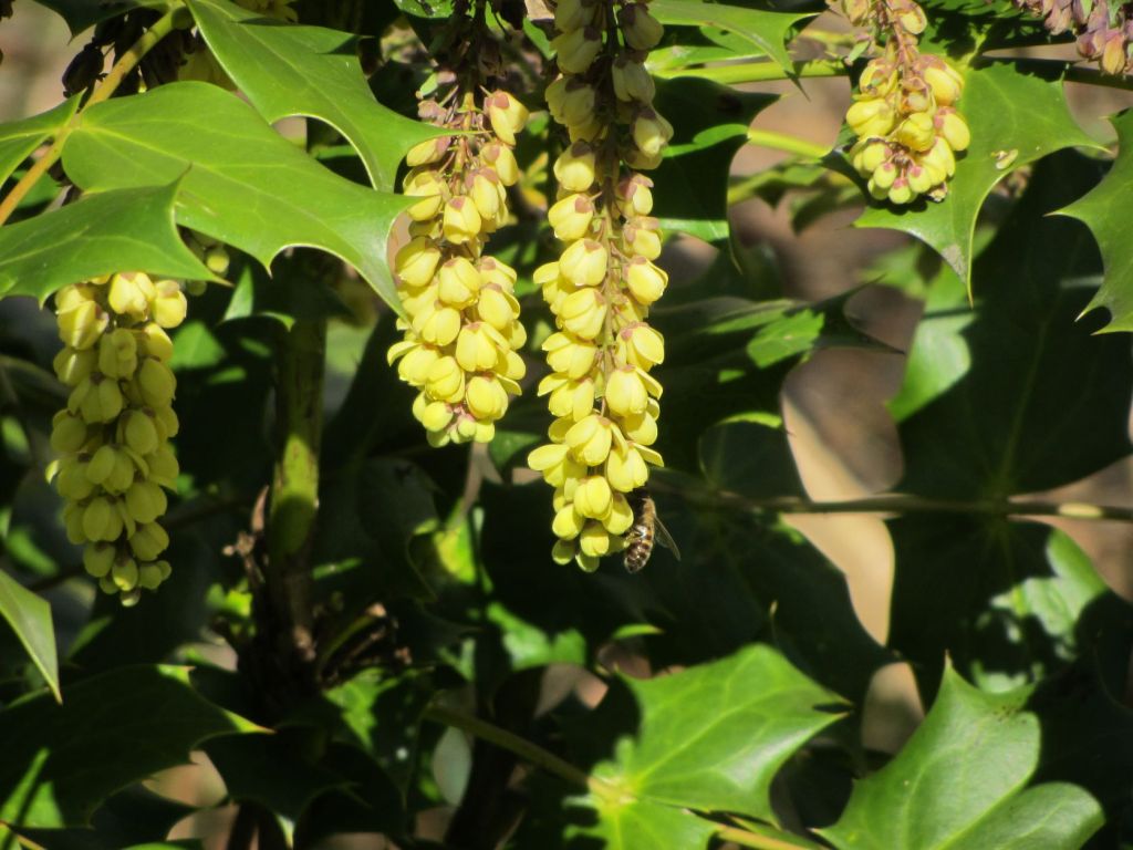 Mahonia flowers are an important nectar source for bees and other nectar loving insects who come out on warm winter days in search of food. Clusters of large purple drupes appear by early summer, followed by colorful new leaves and branches.