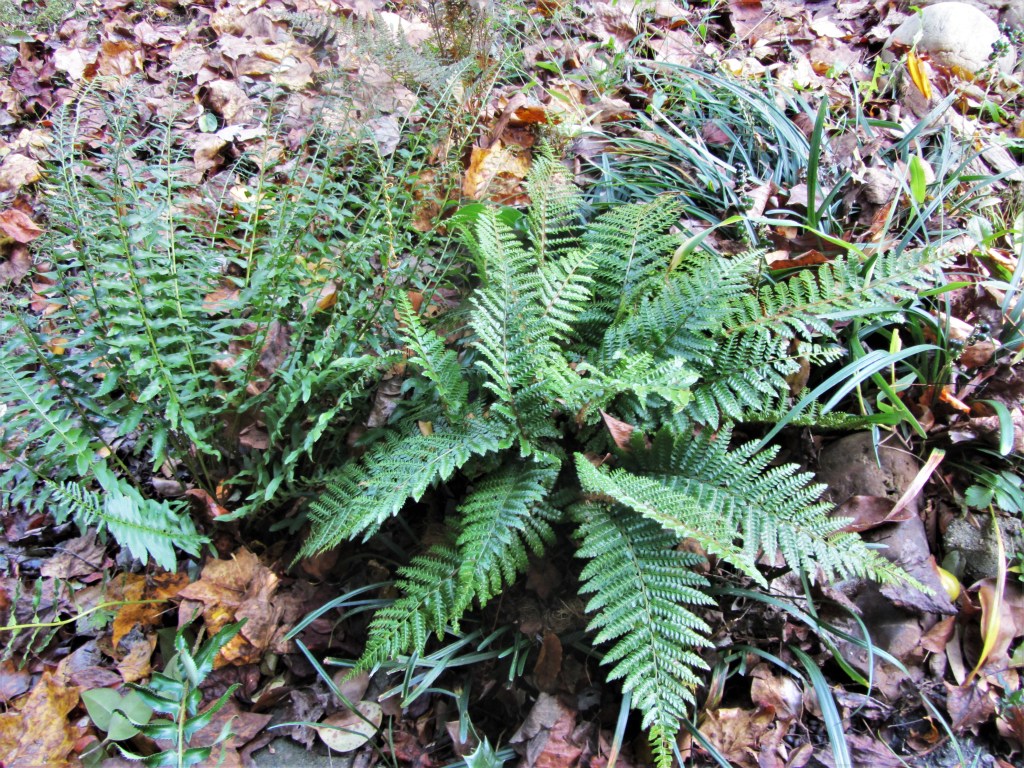 I want to highlight three other types of hardy, evergreen ferns, native to Asia, that will hold their color and presence until new fronds emerge next spring. They are all easy to locate in area garden centers.