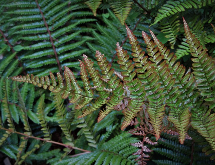 My favorite evergreen fern is the wood fern. Their fronds are sturdy, bipinnate and very graceful You may already be familiar with Dryopteris erythrosora ‘Brilliance.’ It was one of the first ‘colorful’ ferns when it was introduced more than a decade ago. New fronds emerge copper, and slowly settle into a shiny, medium green after several weeks of growth. New fronds emerge regularly from March through late summer. The effect is magical, as many different colors and shades of copper and green mingle on a single plant.