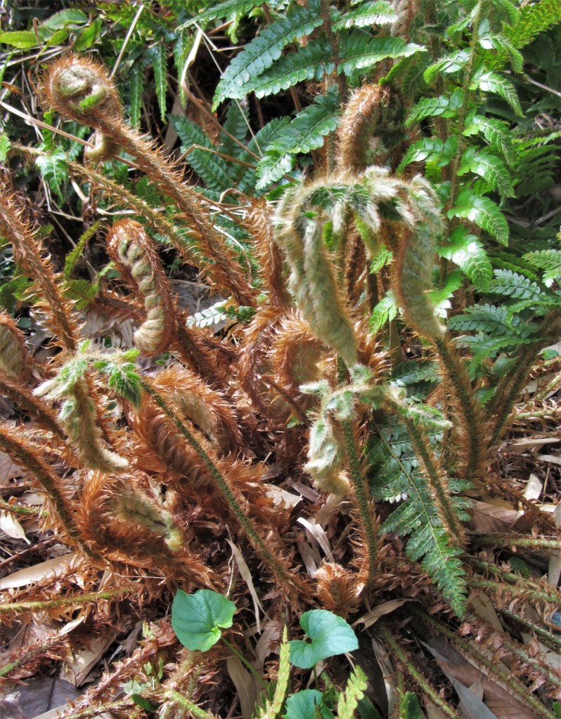 A second tough, evergreen fern with North American relatives is the tassel fern, Polystichum polyblepharum. Also known as the bristle fern, this relative of our Christmas fern has distinctive silvery scales that cover its fiddleheads and stipes. It looks furry and you just want to reach out and stroke it. It is deep green with a silvery brown rachis.