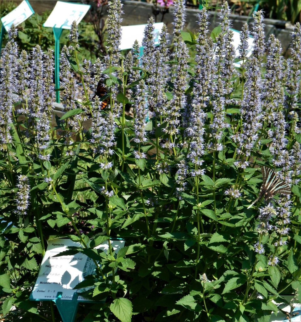 Agastache ‘Blue Boa’ and A. ‘Blue Fortune’ have been popular in recent years. Both are tough and dependable, with large blue clusters of flowers that begin blooming in late May or early June.