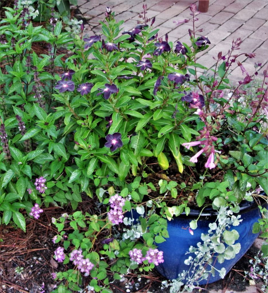 Lantana montividensis is sold as trailing purple Lantana. It remains low growing, but stems may reach out 3’-4’ from the crown. It displays very well in pots and hanging baskets. The flowers are a pastel lilac and may be a bit smaller than Lantana camara flowers, but they bloom reliably and will overwinter most years, even in a hanging basket.