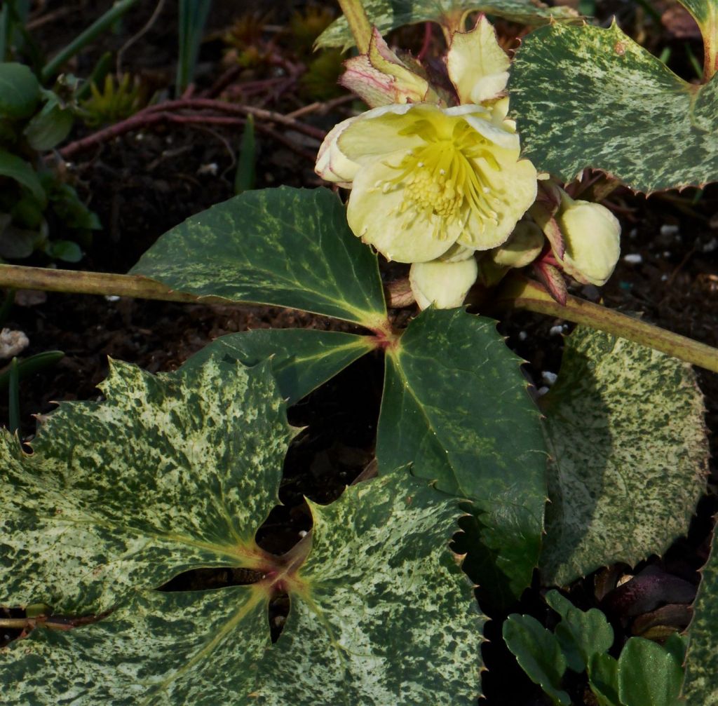 One of the prettiest hellebores, with variegated foliage, is H. argutifolius ‘Snow Fever.’ Its new leaves and flower buds emerge tipped in pink. Its creamy flowers have a cast of light green. It is native to Corsica and is hardy to at least Zone 8. Several named cultivars of H. argutifolius appear on the market occasionally, but they can be hard to find.