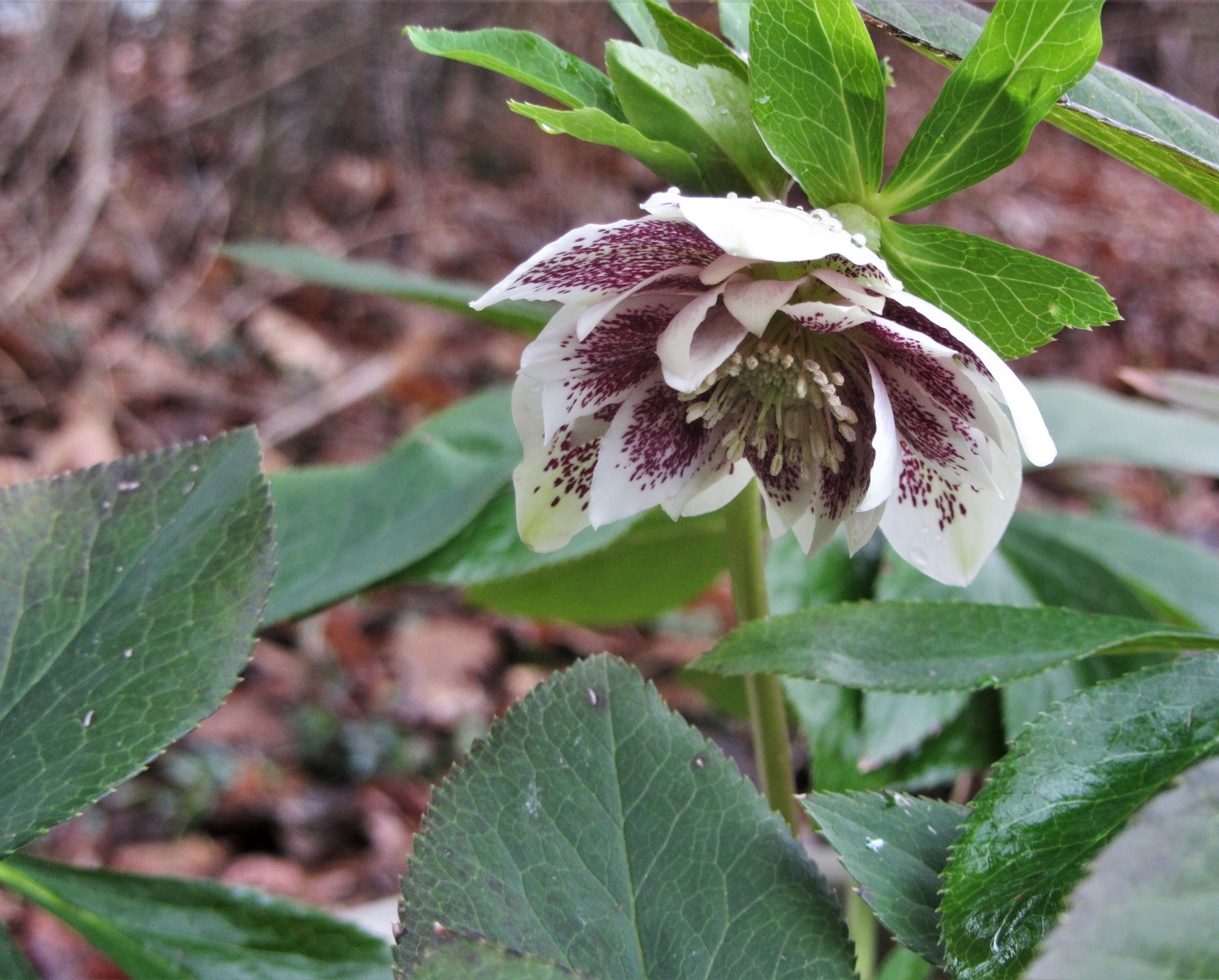 Most hellebores bloom in shades of white, cream, pink, peach, lilac, burgundy, or dark purple, though some flowers are a light, creamy green. Many have “freckles” on their faces. While most are singles, some varieties are doubles with intricate patterns of petals and showy stamens. Hellebore blossoms are only fully appreciated when viewed up close because most cultivars hold their blossoms facing downwards. One must come in close and lift each blossom to see its face.