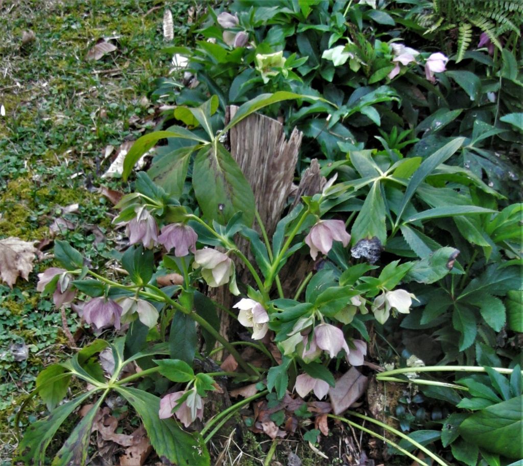 These little hellebores, which look a bit like glossy green clover on steroids, with their three-lobed seed leaves, will each grow into a hardy evergreen plant that eventually stretches to about 2 feet across. Our mature, blooming hellebores have been covered in bees and other pollinating insects on warmish days because their nectar and pollen are so abundant and good. But the places where these babies had taken root will be mown again before May.