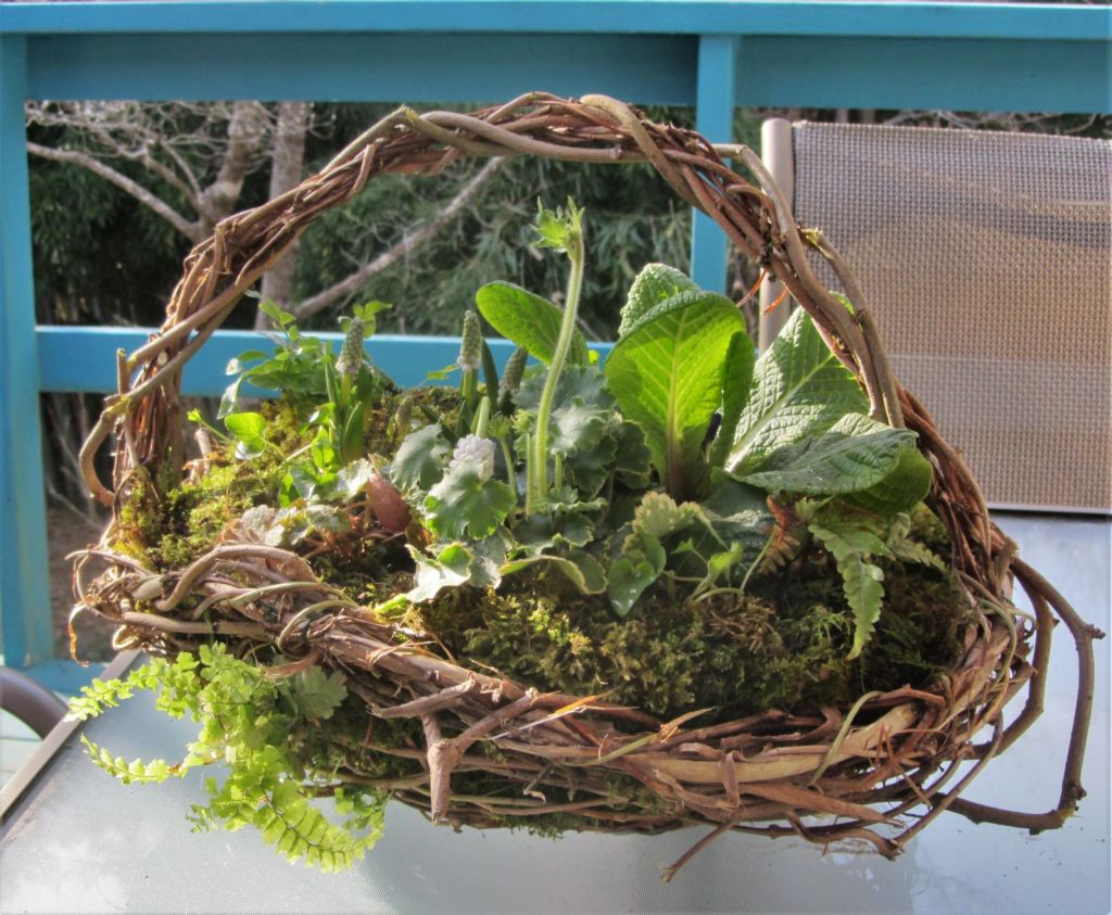 Wonderful to hear from you, Sue. Carpenters advise to measure three times and cut once. I think it is even more important to think things through awhile before moving and planting things in the garden. A lot of times plants respond really well to thinning and moving with more vigorous growth afterwards, so it is a win-win. Winter is a good time for thinking about what changes to make, particularly if you have photos of past seasons to review. The basket is pure experiment and I’m happy with how it came out. I am experimenting with a method for growing mosses in 3-D containers with the moss layer backed by a layer of felt, and then a layer of plastic. The back of the moss isn’t in contact with the potting soil, except on the very top of the arrangement. The moss should eventually grow outwards, through the vines that make up the body of the basket. The fern on the side is set in a slit in the felt and the plastic liner to grow into the potting soil. Fingers crossed that it all grows in and thrives OK. Something should be in bloom in that arrangement through at least the end of April if all goes as planned. I’m glad you like it. ❤ ❤ ❤