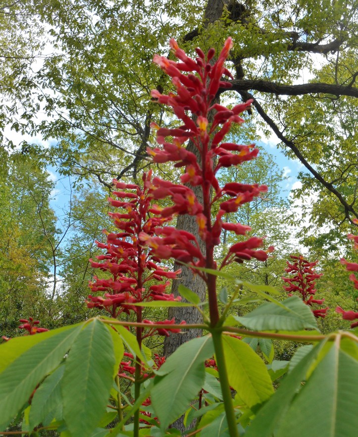 We had a seedling scarlet buckeye large enough to bloom for a year or two before it was flattened when a large oak fell on it during a storm.  I was so disappointed.  But the little buckeye survived, growing again from its roots, and nearly 10 years later it is nearly 10’ tall.  A. pavia will eventually grow to around 25’ tall and 20’ wide.  Allow it to develop multiple trunks, or train it to a single stem.