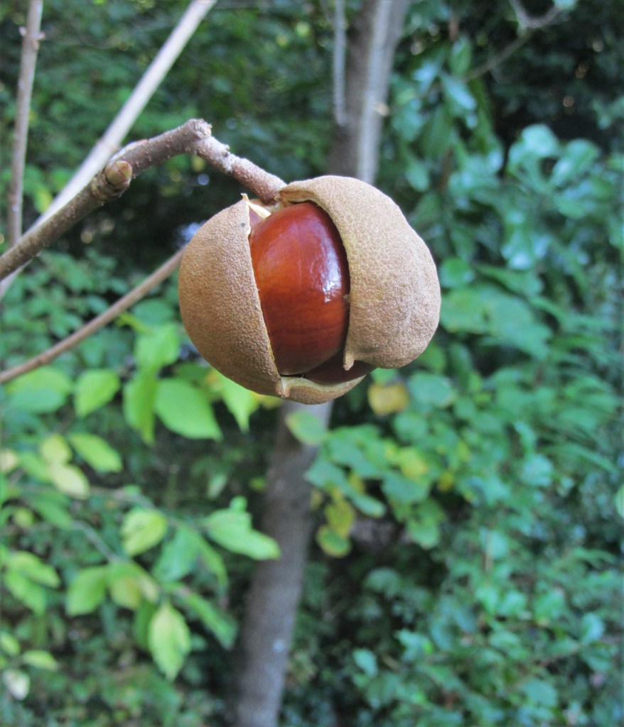There are at least five species of Aesculus in North America, all with distinctive large palmate leaves, showy flowers and large nut-like seeds.  Aesculus flava, the yellow buckeye, native to the Eastern United States, is hardy in Zones 3-8 and blooms with yellow flowers.  It grows into a larger tree to 60’ and is also poisonous.