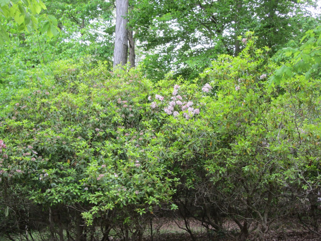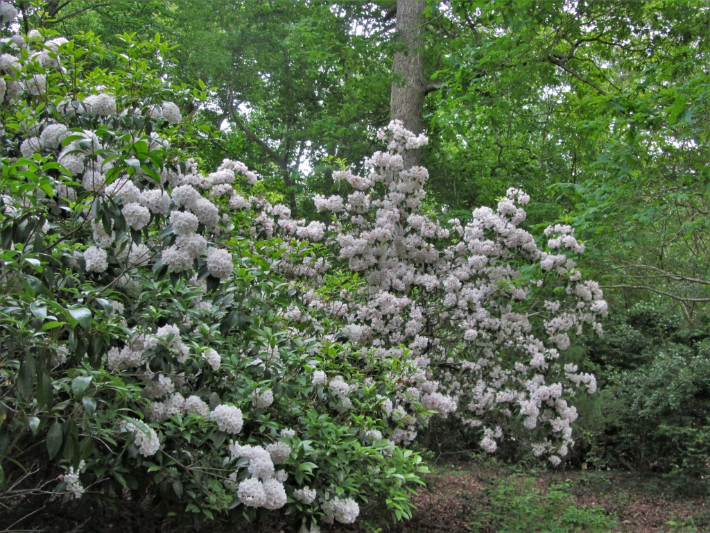 These evergreen shrubs, almost small trees, simply blend into the fabric of the woods through much of the year before bursting into bloom, suddenly elegant and beautiful, in late April and early May. The native species mountain laurel has flowers of white or pink. Some cultivars in the nursery trade have been selected for darker flowers of red or maroon. Ours probably pre-dates our neighborhood, from when this forested land was still undeveloped.