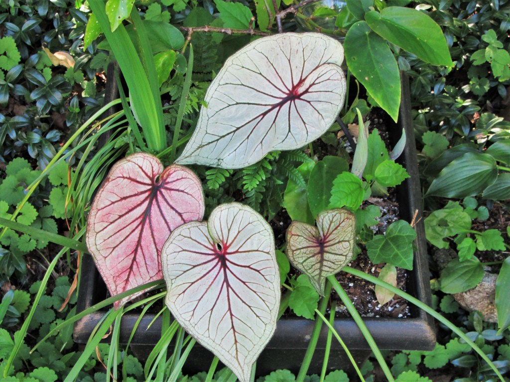 I planted a shipment of new varieties of Caladiums in early May, directly into pots where I wanted them to grow . And they sat. We still had some really cool weather in early May, and Caladiums love the heat. It has been so long since I planted them that I’ve been worried that they weren’t going to sprout; that I’d spoiled them by planting too early in the season.