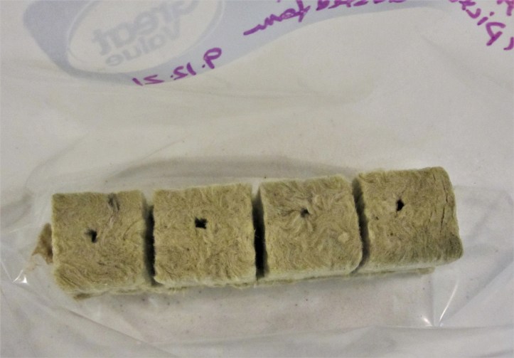I was tempted to chuck all of the bags in the trash as a failed experiment, but decided instead to fill one of my large plastic boxes, normally used for starting Caladiums in the spring, with some potting soil and just move all of the blocks of rock wool into the box. I poured the remaining spring water from each bag onto the soil, covered the box with its tight fitting lid, and put the whole thing in a shaded, protected corner of the deck. And it has been there ever since.