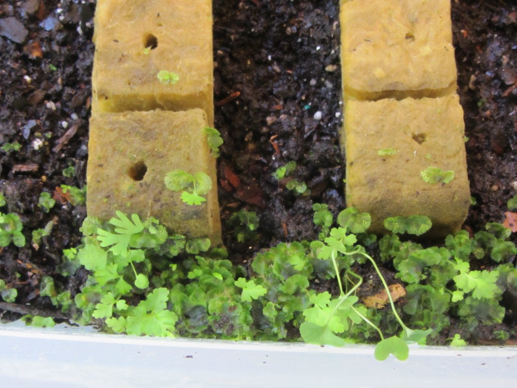 I checked the box of rock wool cubes once more, a bit later into the summer, to see if it was still moist, and finally pulled the whole box out of its corner again yesterday. When I lifted the lid, I was happy to find clusters of little gametophytes and even a few sporelings. And even some of the rock wool cubes further away from the light show green growth. It has taken much longer than I expected, but a good crop of sporeling ferns is on the way.
