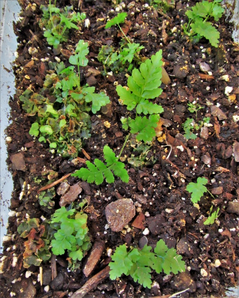 Nature, and natural processes, remain a fascinating mystery. All of this just demonstrates, yet again, that patience is the first and best skill a gardener needs to learn. By giving those spores sown on rock wool the gift of time, they have come along when conditions proved favorable for growth. It may be another year before they have grown enough to plant them out into a bed or to pot them up to give away. But I believe that the day will come when the sporelings will be ready to leave their box and grow on as beautiful ferns.