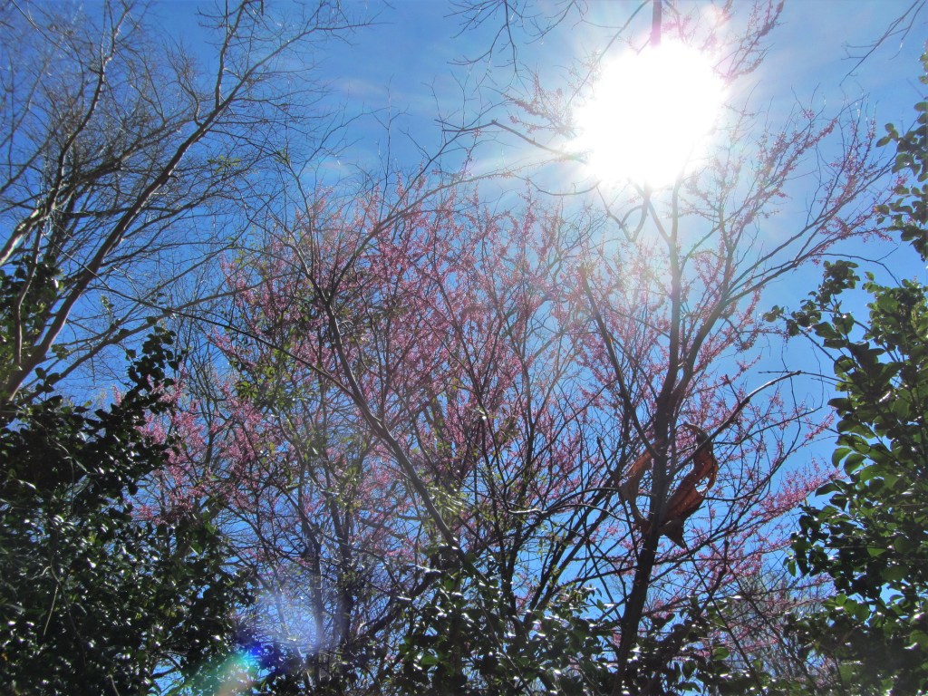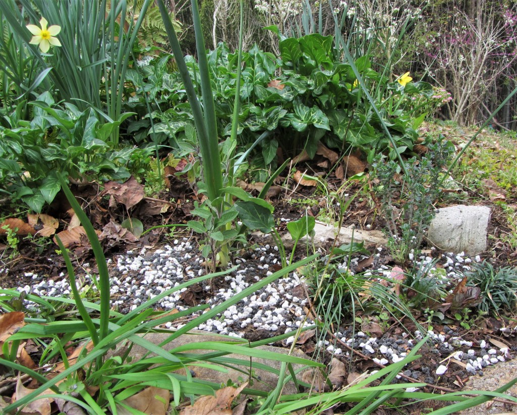 By the time the wheel of the year has turned back to the spring equinox, I’ve grown accustomed to the stark simplicity of our garden in winter and almost don’t remember the bounty of past summers. I’ve grown accustomed to the sculptural symmetry of bare branches reaching for the sky. The low, nearly empty garden beds look simple and right. Any emerging green leaf is an appreciated sign of life. I can see all the way across our small plot from side to side with little of substance to stop the eye besides the trunks of oak and stand of mountain laurel.