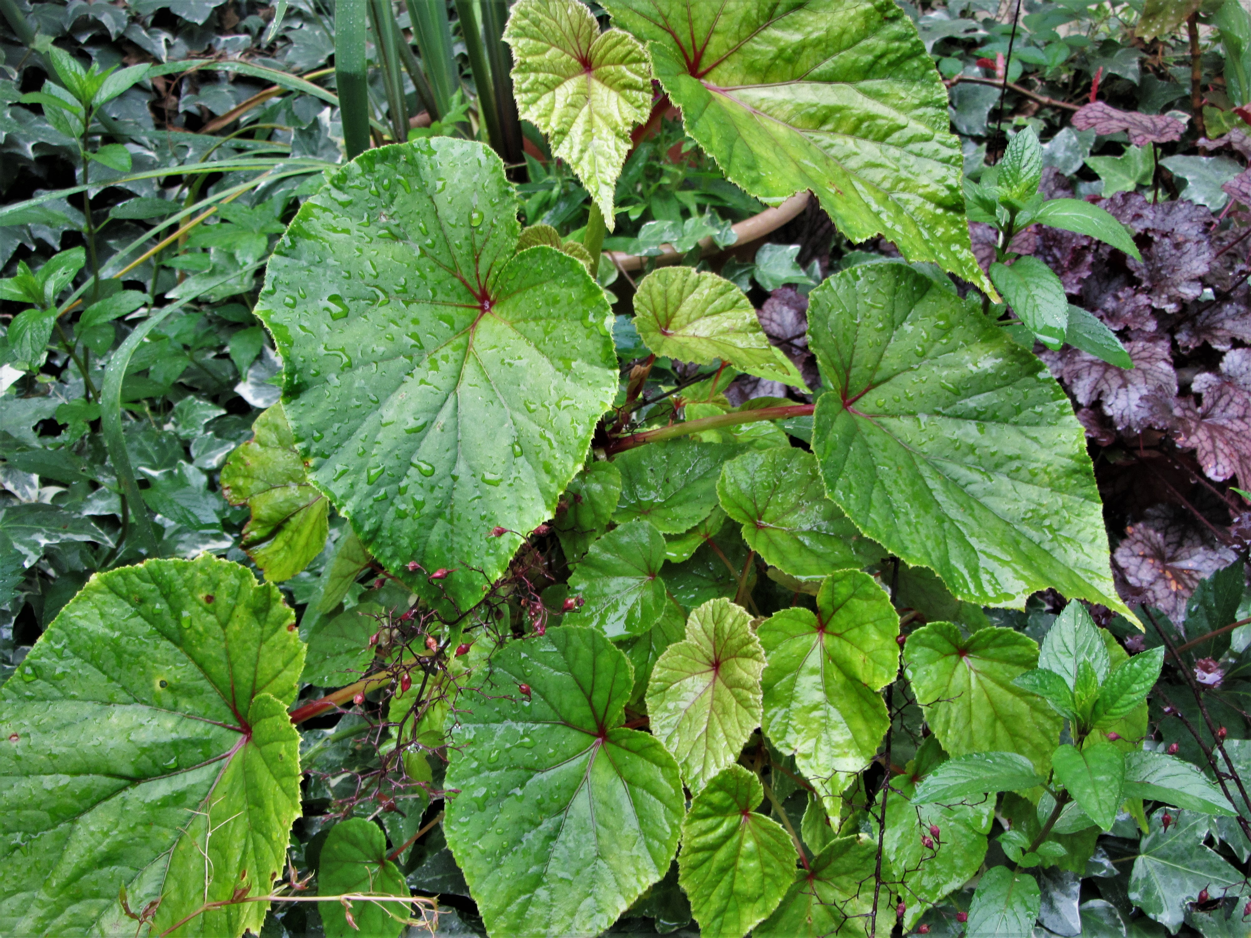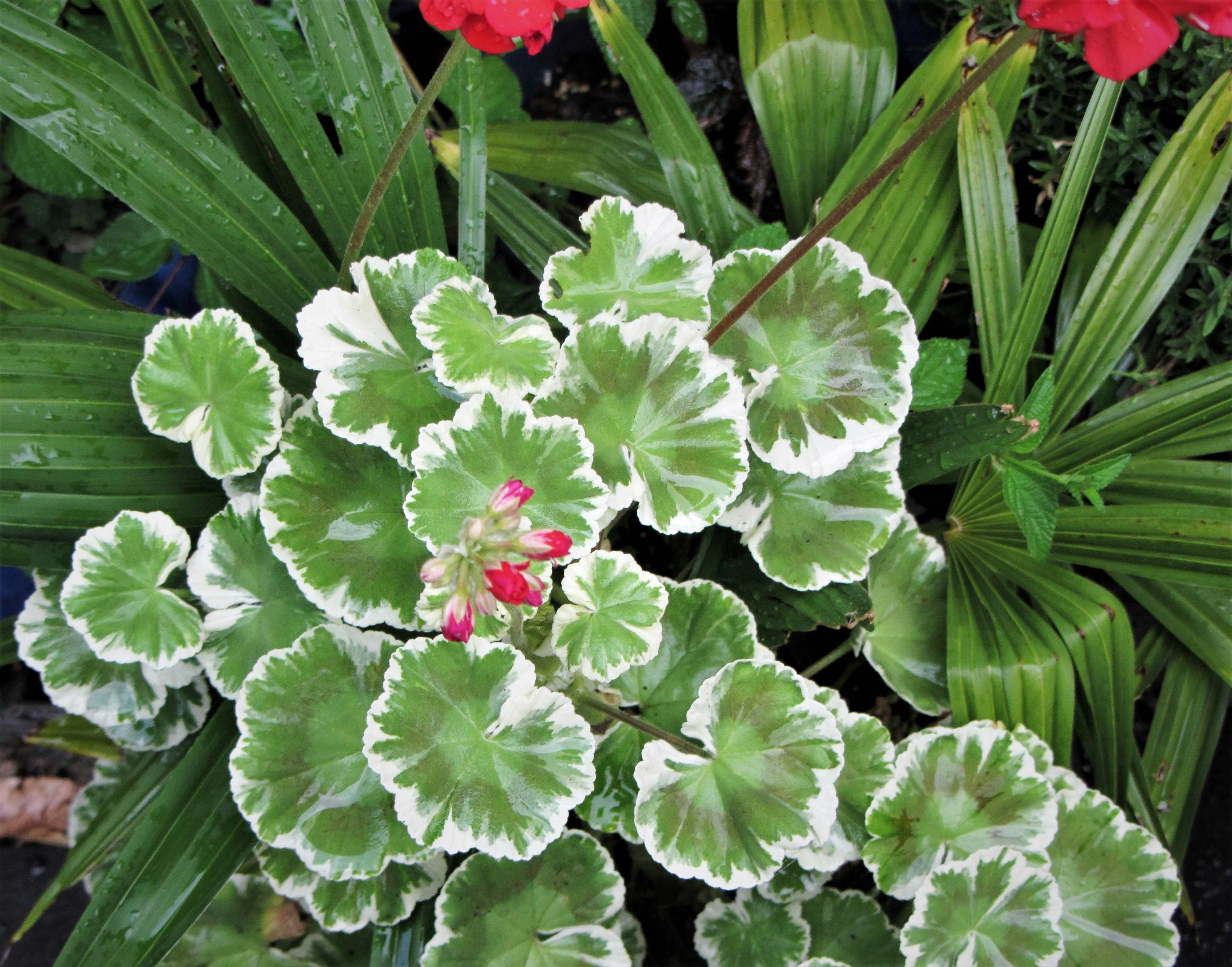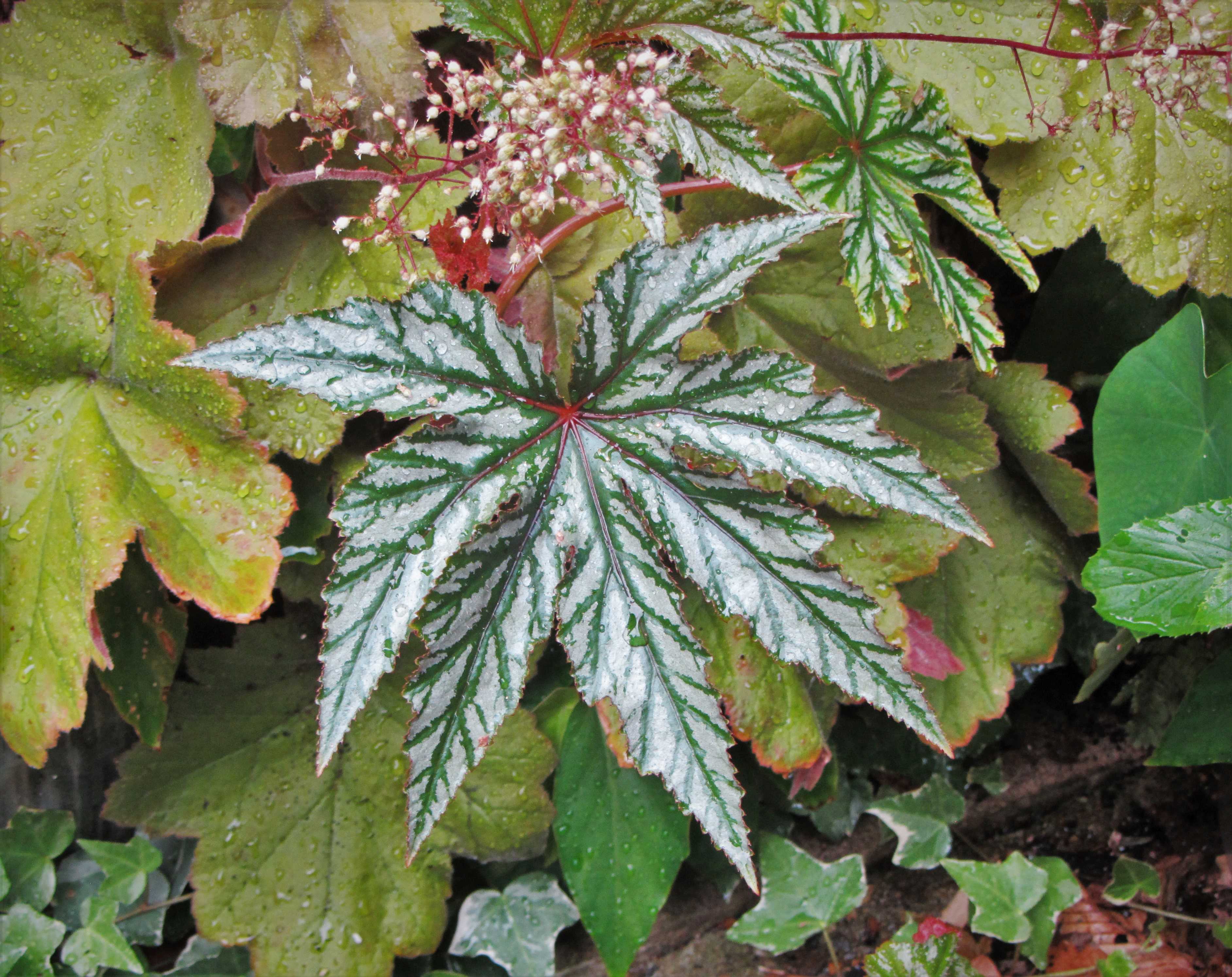 So in July and August, I’m loving those plants with interesting leaves. They want for little except for watering and an occasional feed with fish emulsion. Yes, we still have flowers. I love the ones that groom themselves, or that we let go to seed for the birds. But for dependable color, give me a Caladium or a Begonia. Variegated geraniums, variegated ferns, silver leaved plants and an abundance of herbs carry me through the heatwaves of summer. I can water them at dawn, and then take refuge inside until dusk.