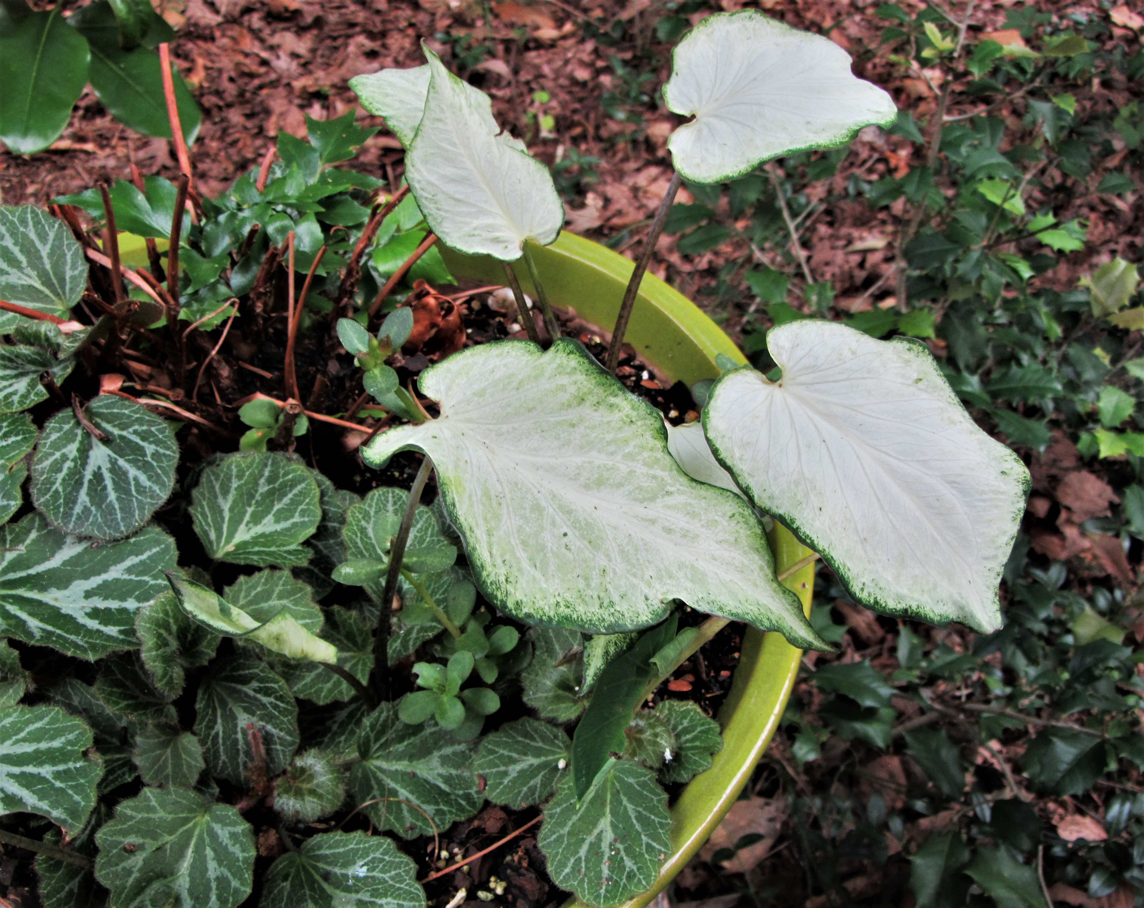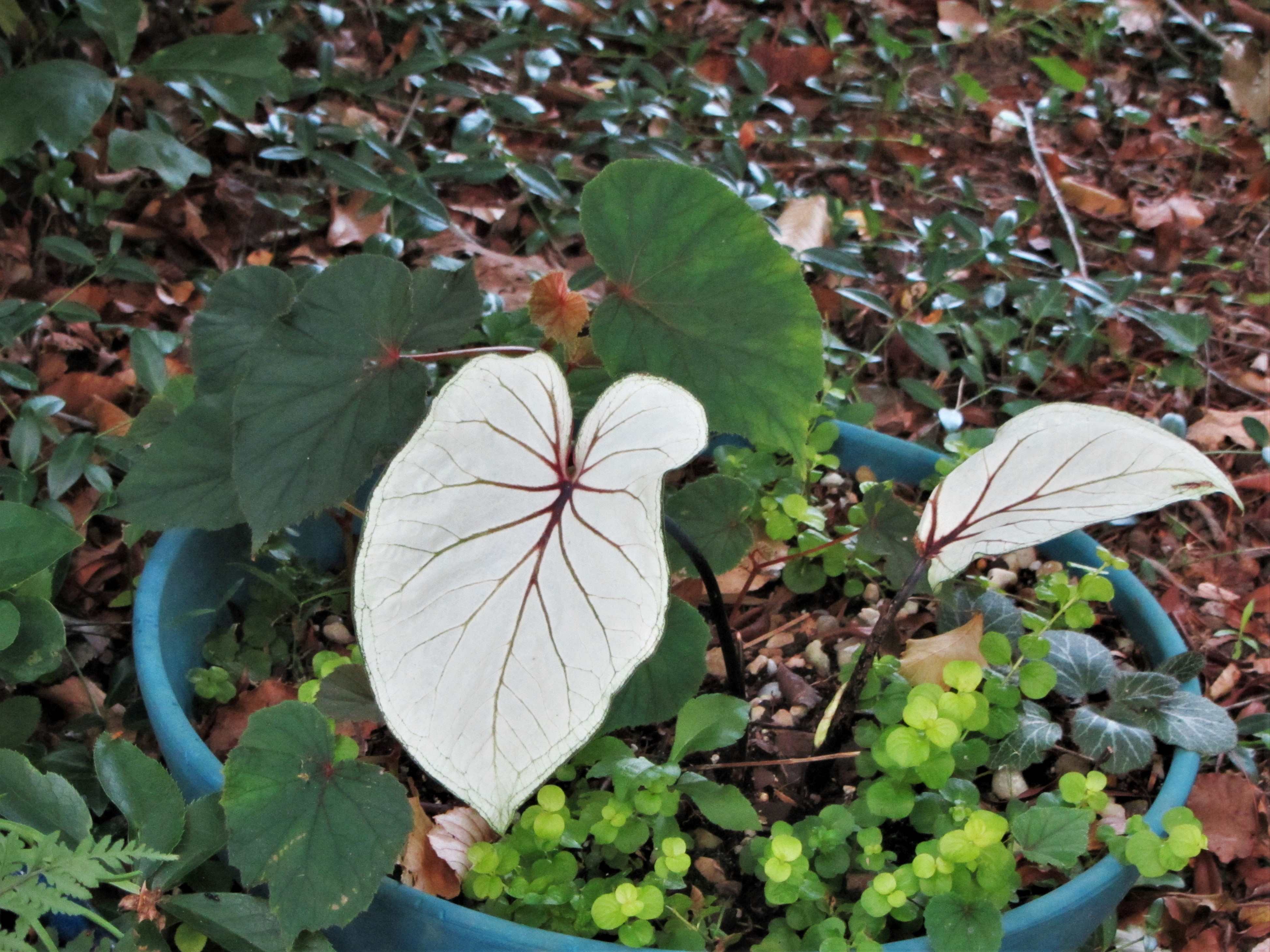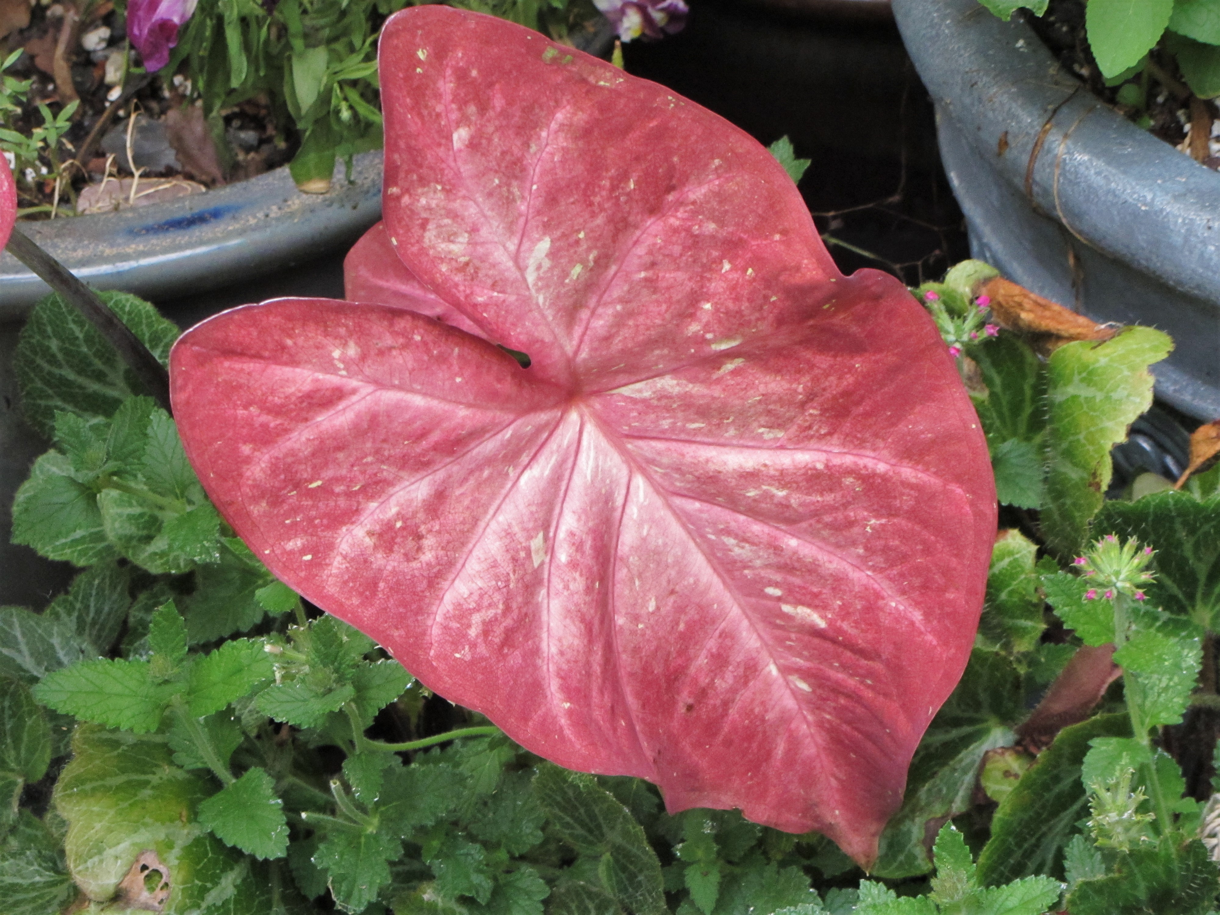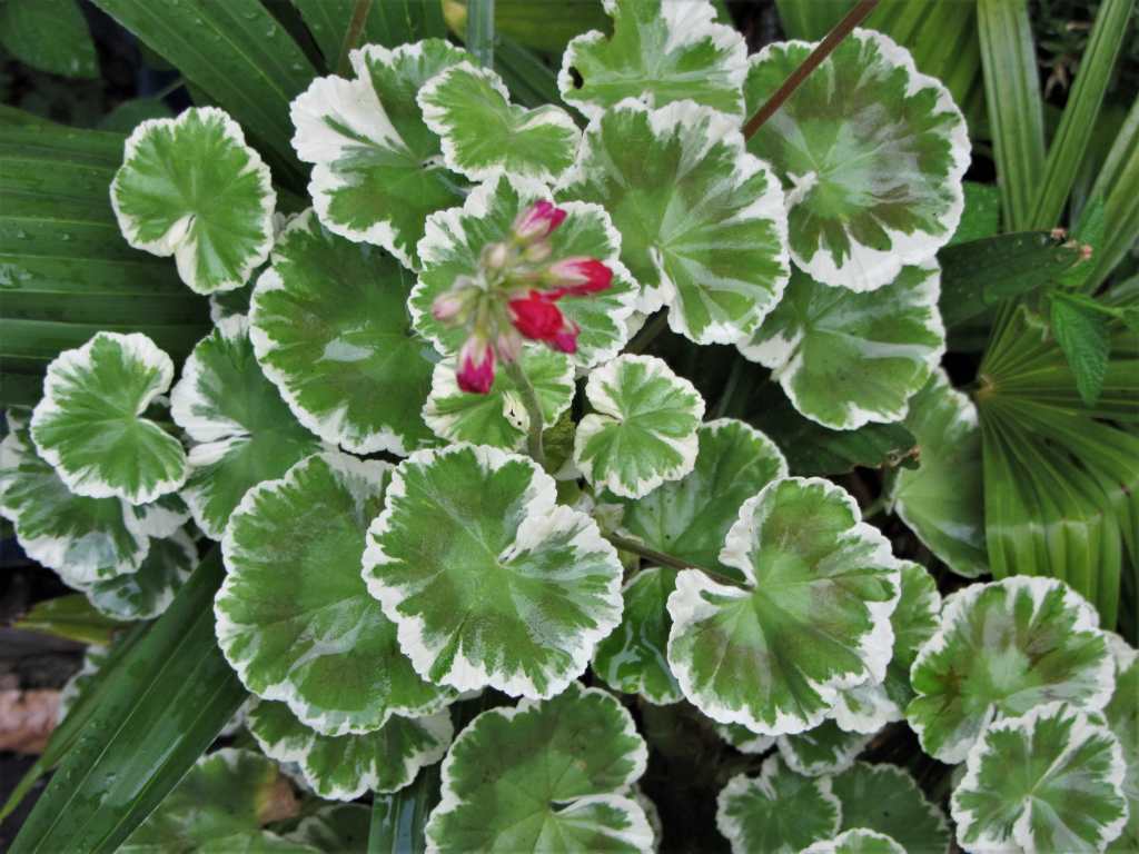 So in July and August, I’m loving those plants with interesting leaves. They want for little except for watering and an occasional feed with fish emulsion. Yes, we still have flowers. I love the ones that groom themselves, or that we let go to seed for the birds. But for dependable color, give me a Caladium or a Begonia. Variegated geraniums, variegated ferns, silver leaved plants and an abundance of herbs carry me through the heatwaves of summer. I can water them at dawn, and then take refuge inside until dusk.