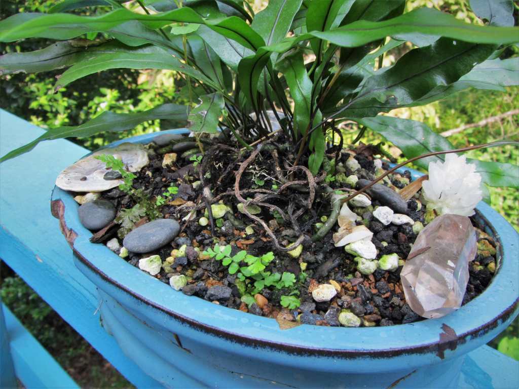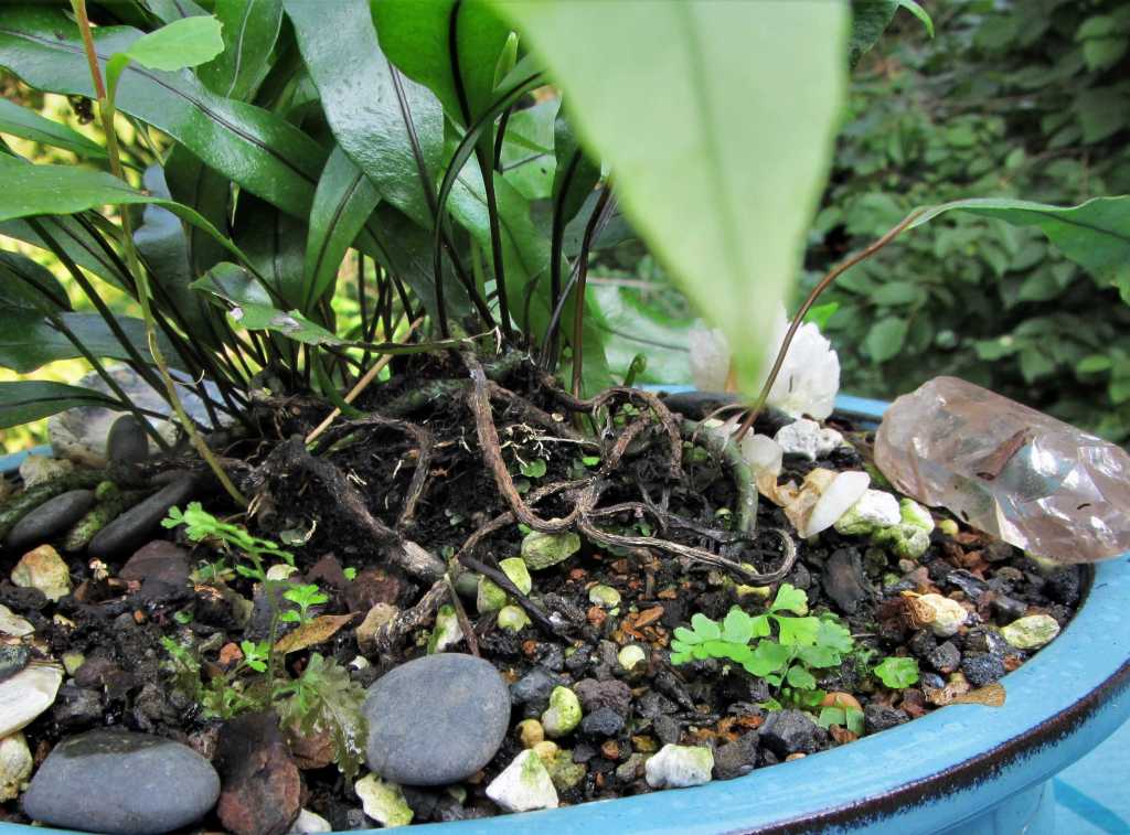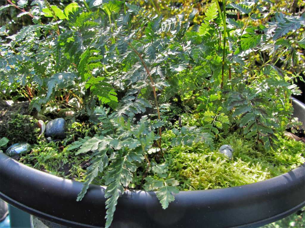 The soil in the larger pot is more likely to remain damp enough if I miss a day or two of watering. I’ve lost many of the baby ferns I’ve planted in small pots, and still have most of the ferns I planted into larger, established plantings. There is no sterilization of soil when planting into a larger planting, of course.