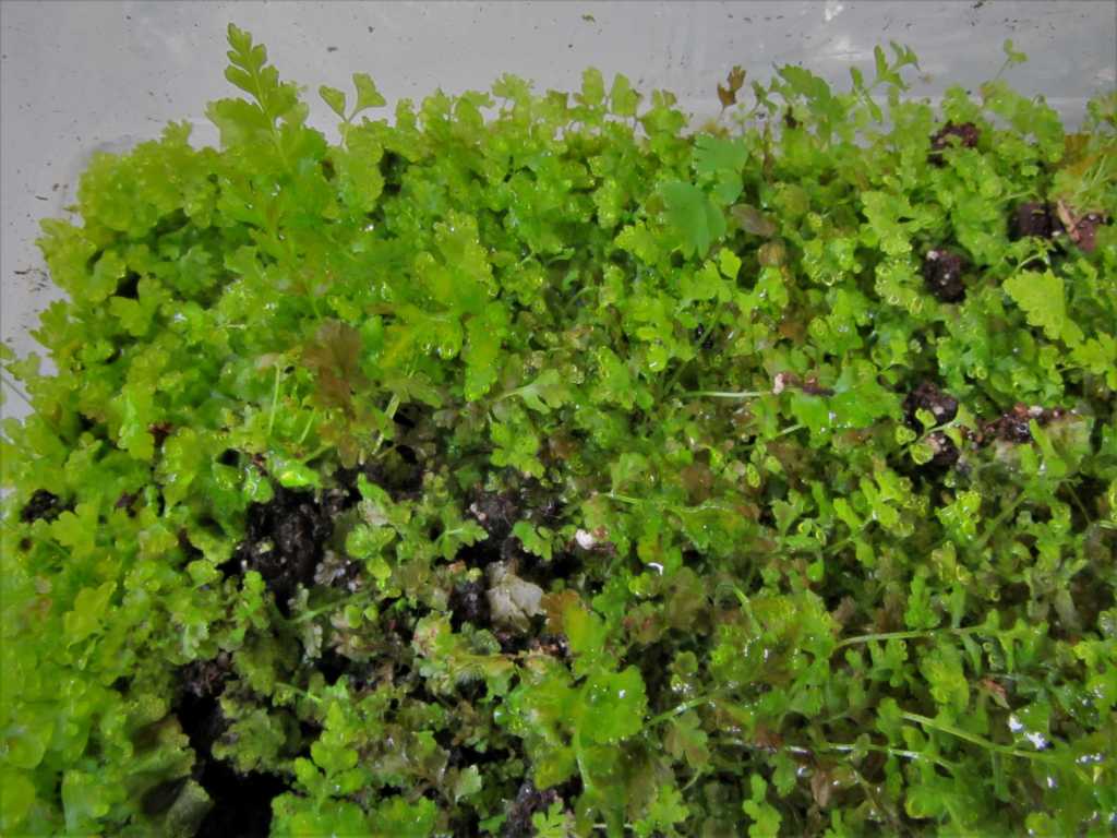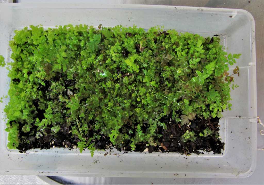 I have also found that trying to pull sporelings apart into separate little plants, each growing from its own roots, is also fraught. The tiny plants and roots are extremely delicate at this stage. I have had the most success with allowing the fern to continue its growth in the propagation box until it is a few inches tall. Then, very gently scoop a small clump of ferns and surrounding prothallium out of the box with a plastic spoon, and then deposit the clump into a waiting container.