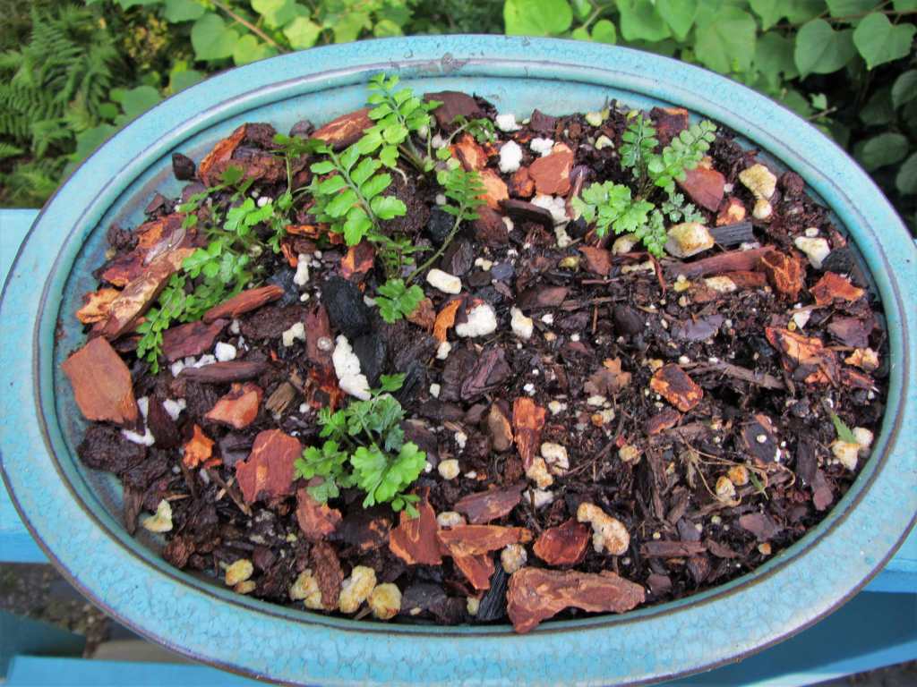Newly transplanted ferns may also be mulched with gravel, or very fine bark mulch. I often use bonsai or orchid planting media as a permeable, but protective mulch. Misting frequently helps if the air doesn’t have at least 50% humidity. I find that sporeling ferns grow well outside, on a protected deck in full shade during the summer months.