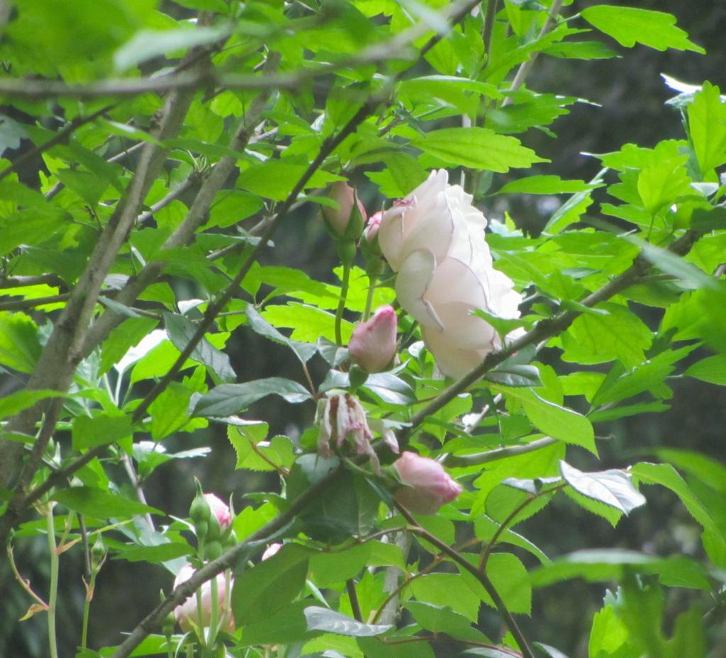 These climbing roses are visible from my kitchen window, so I can enjoy them even thought they are growing up through shrubs in the back garden. Of the many roses I’ve planted in this garden ‘The Generous Gardener’ is a true survivor, probably because it grows up beyond the reach of the deer.