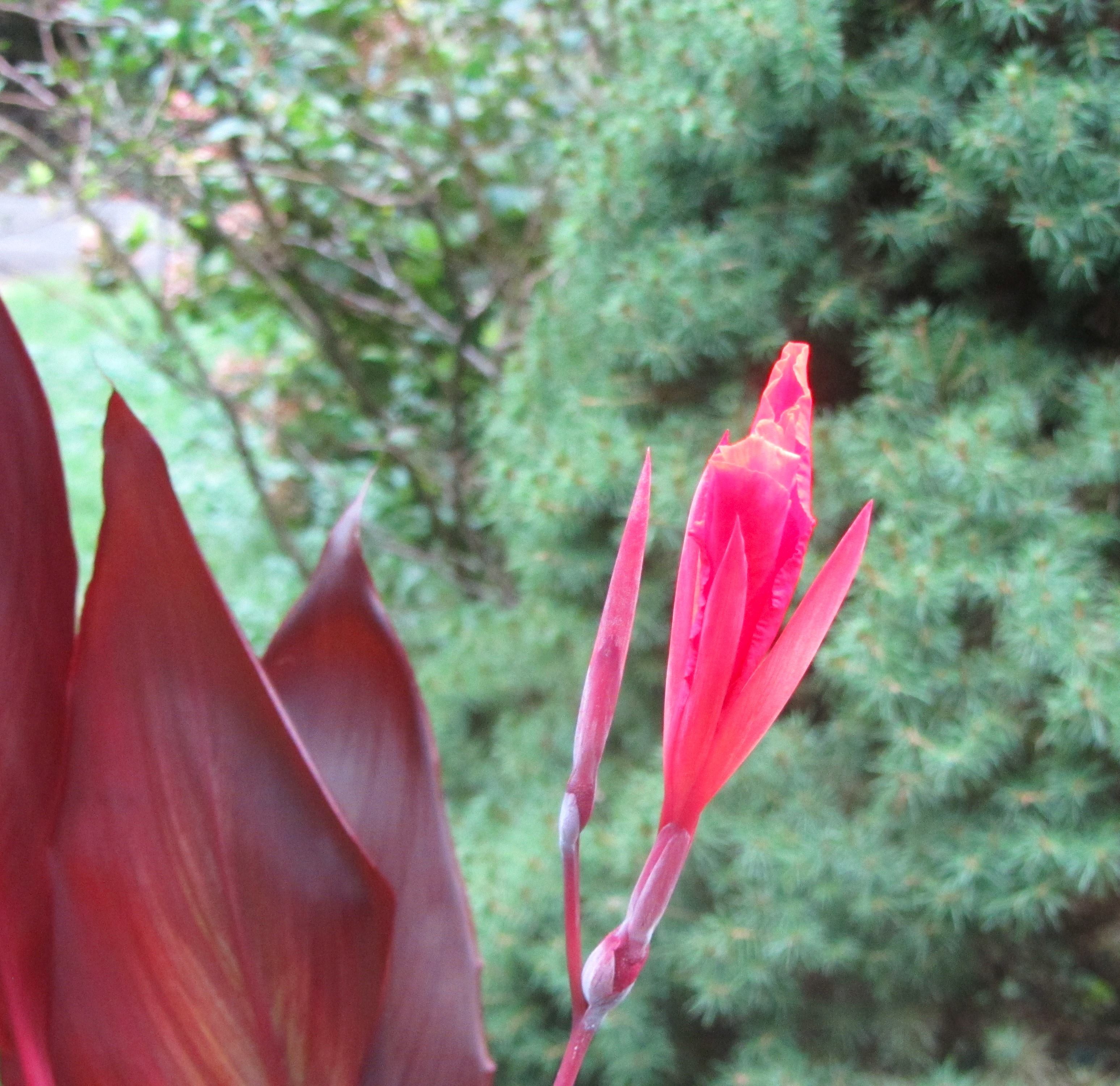 It was absolutely gorgeous, with several blooms on Friday. We had a gust front blow through here with damaging winds on Friday evening and it blew the tallest canes right over. We lost the flowers, but I have propped up one of the canes and put the other in a vase to enjoy indoors. I am sure new canes, and flowers, will emerge soon. We are enjoying it so much! The other Cannas are growing well, but haven’t yet bloomed. We keep watching for them!