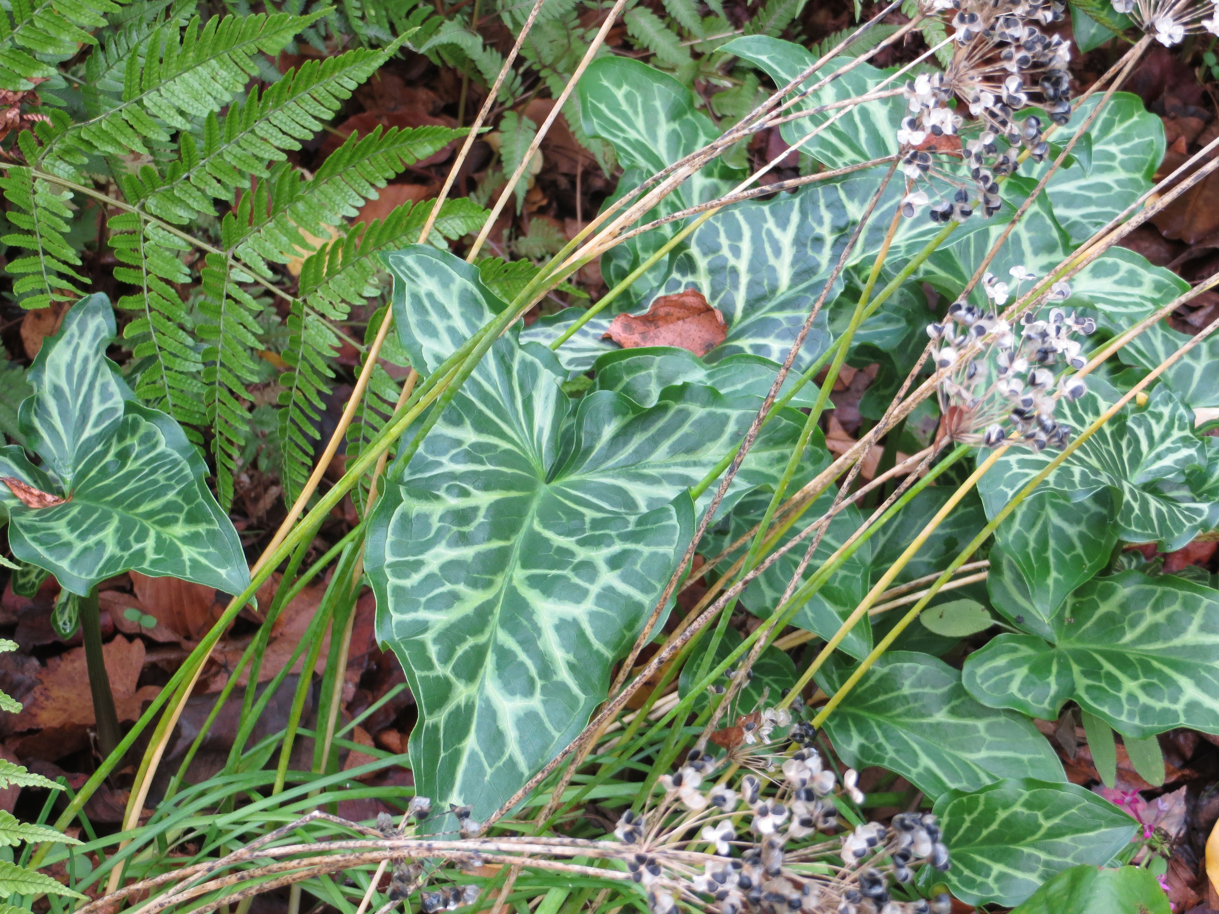 The Italian Arum has emerged in beds and pots, filling space between the ferns in anticipation of daffodils emerging among its sharply marked leaves. This is one of those reliable plants that marks the seasons for me with its comings and goings. I love that it emerges in all of its beauty while so many other plants are dying back.