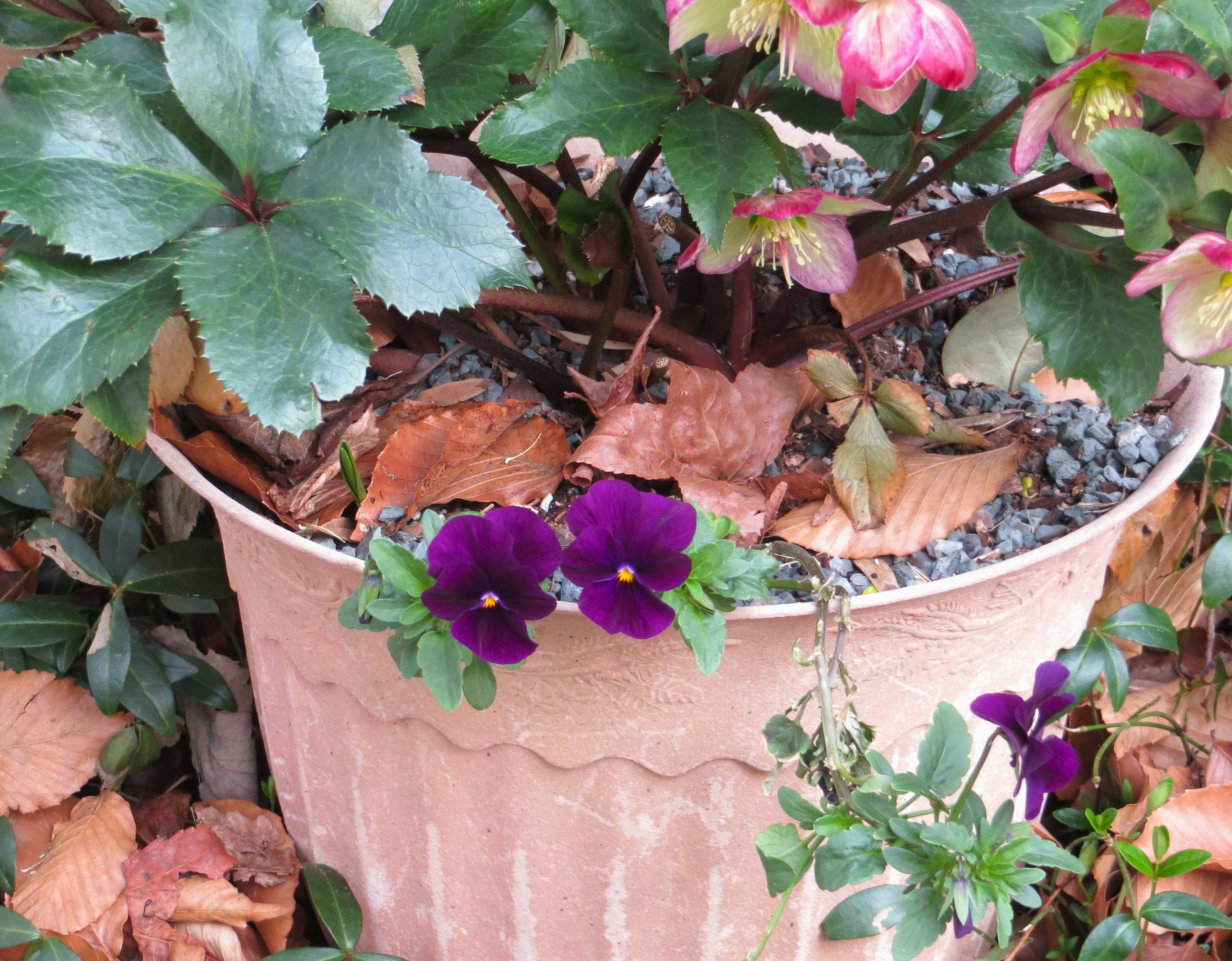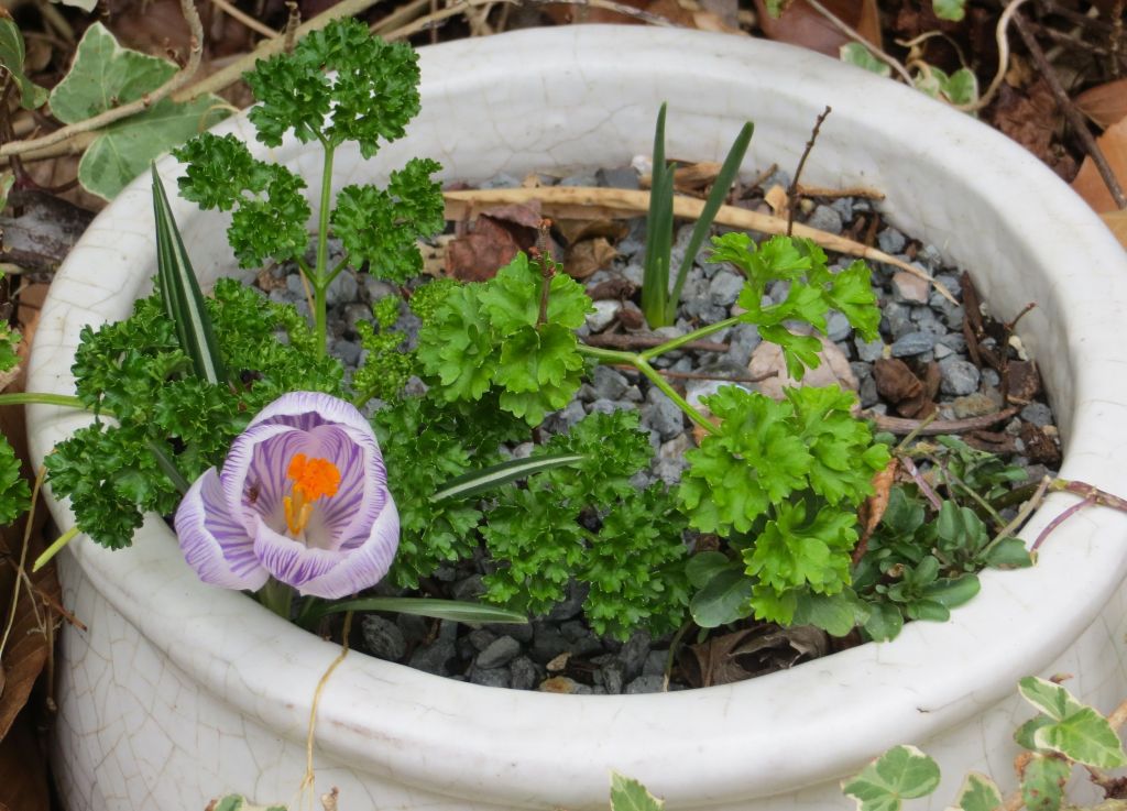 “It is easiest to start again small. Small flowers from very small bulbs, like grape sized Iris reticulata and I. histrioides. Small roots on small cuttings, carefully planted into small pots to ‘grow-on’; and small starts in small pots that will move up into hanging baskets and potted arrangements once the weather warms.”