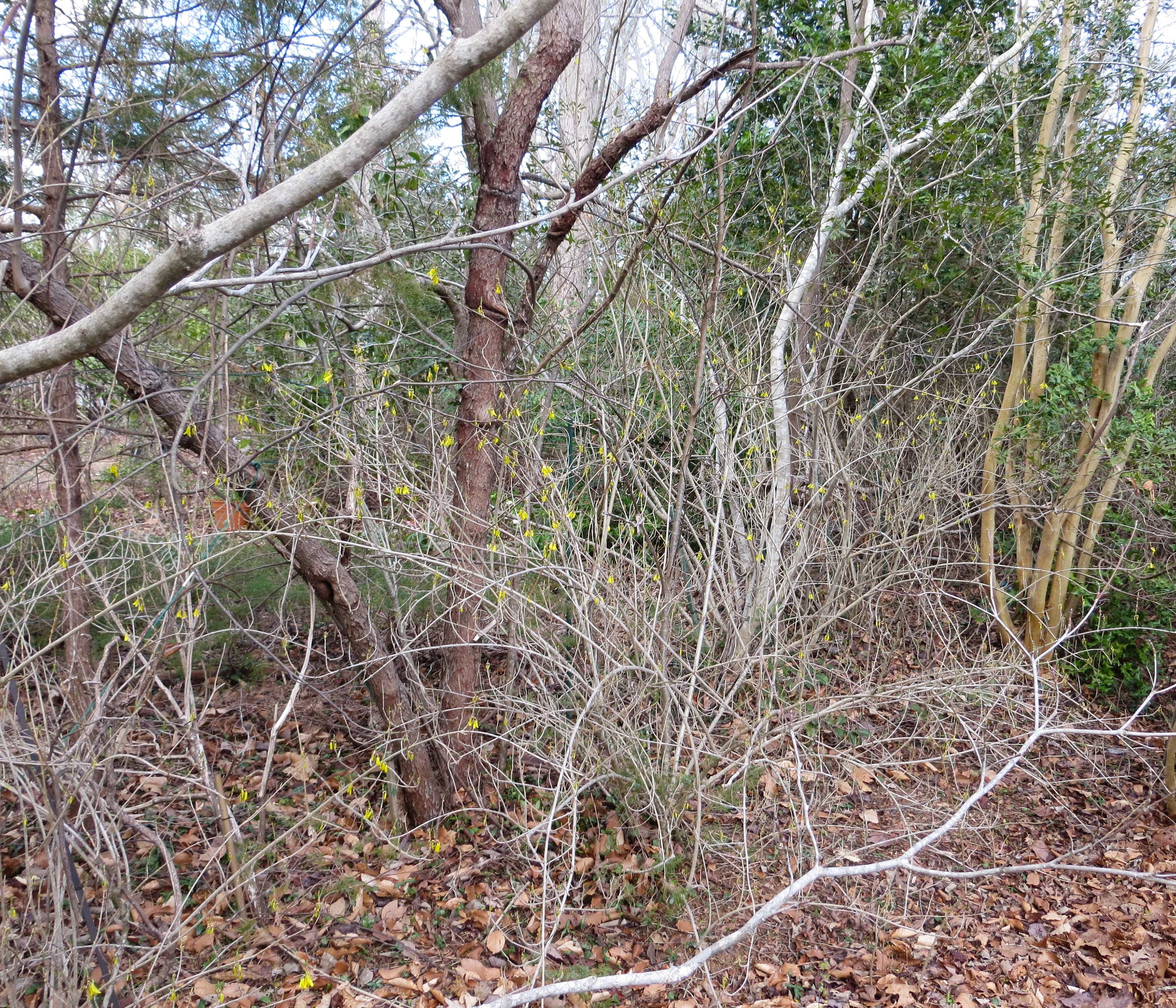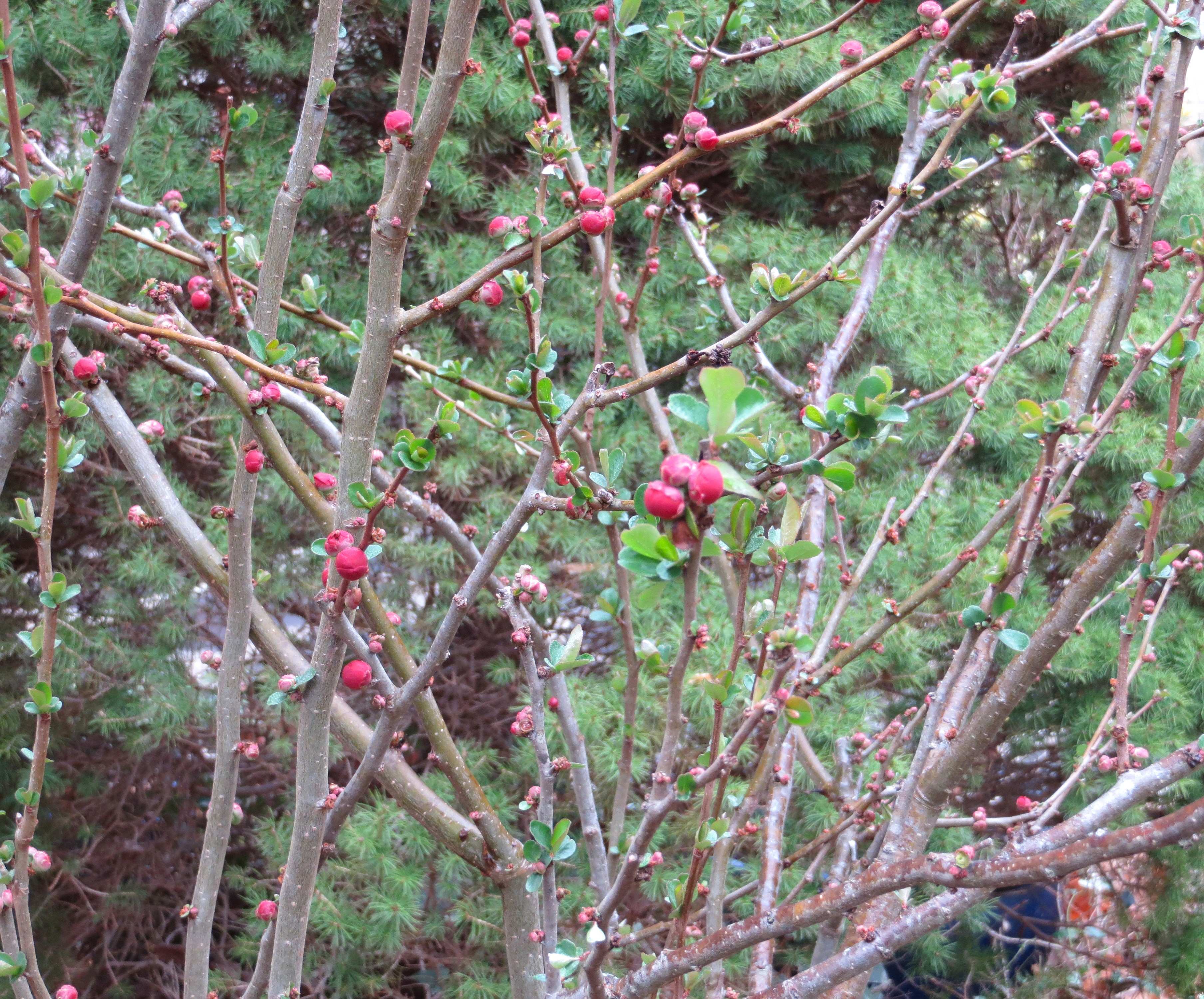 Everything is a bit late this year, in our area. The flowers on our grape Mahonia, which often open to feed hungry bees by late December, were just opening their first few buds when I checked them on Thursday. The Chaenomeles, hybrid Japanese quince, are budding. But not a single flower has bloomed. The Forsythia began blooming this week and looks a little better each day. It is good to have color again amid these great bushy bare shrubs, but I have seen Forsythia bloom before mid-February in previous years. Maple trees are swathed in deep red as their buds begin to open and catkins hang from every hazelnut. We are still enjoying Galanthus and tiny early Irises in containers here and there, even as more daffodils bloom each day.