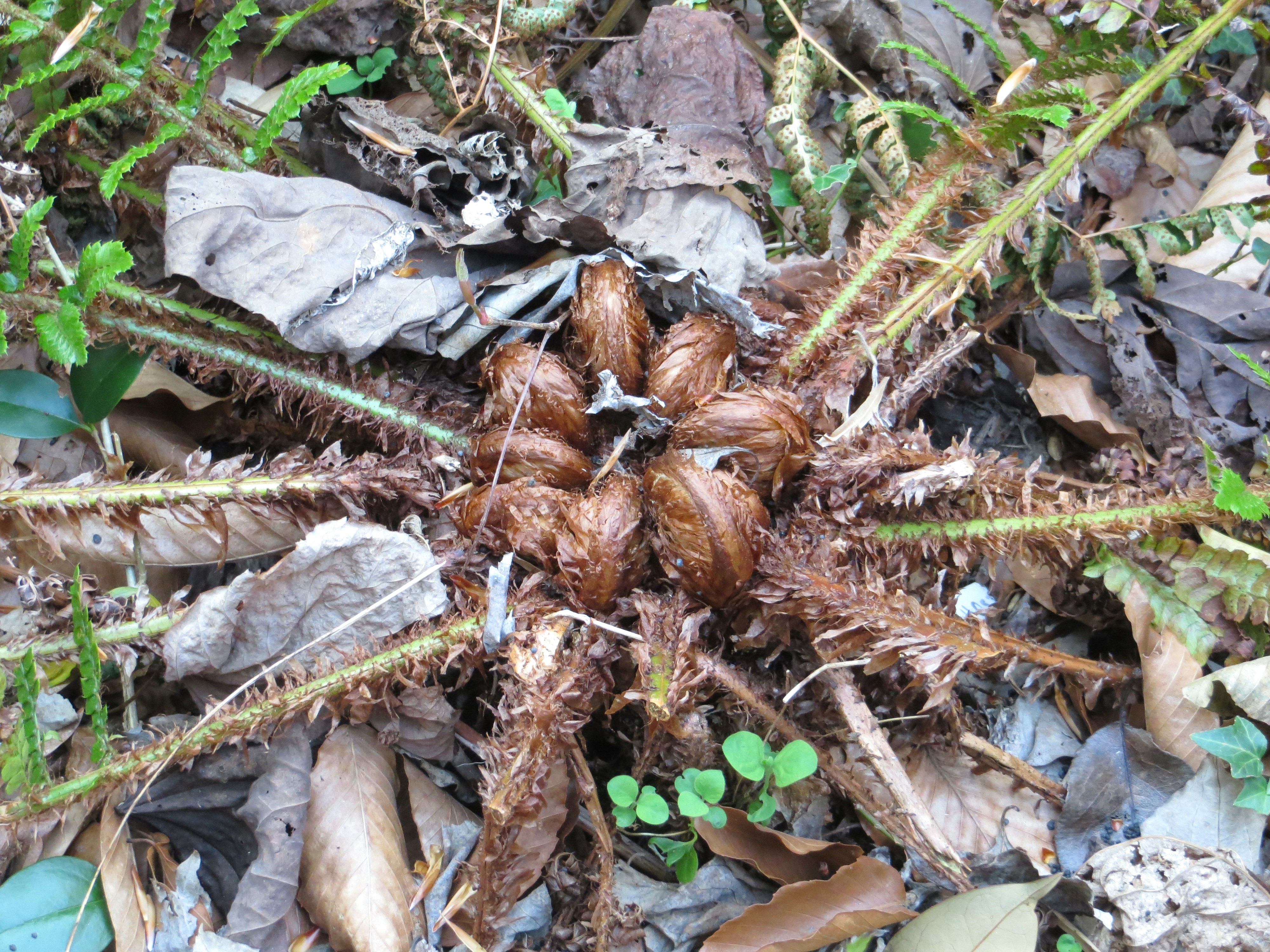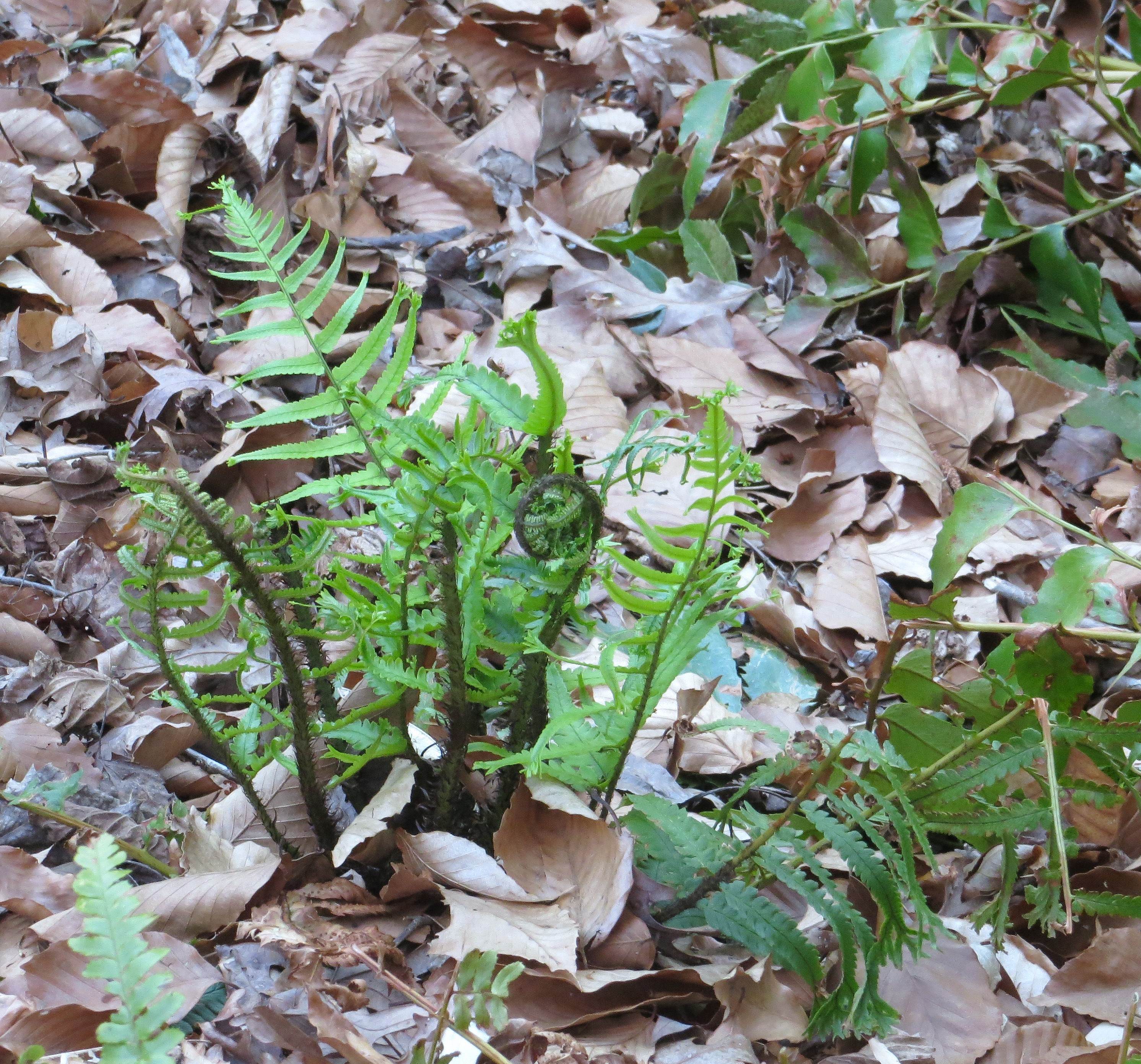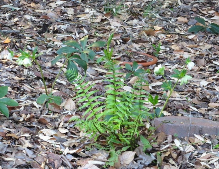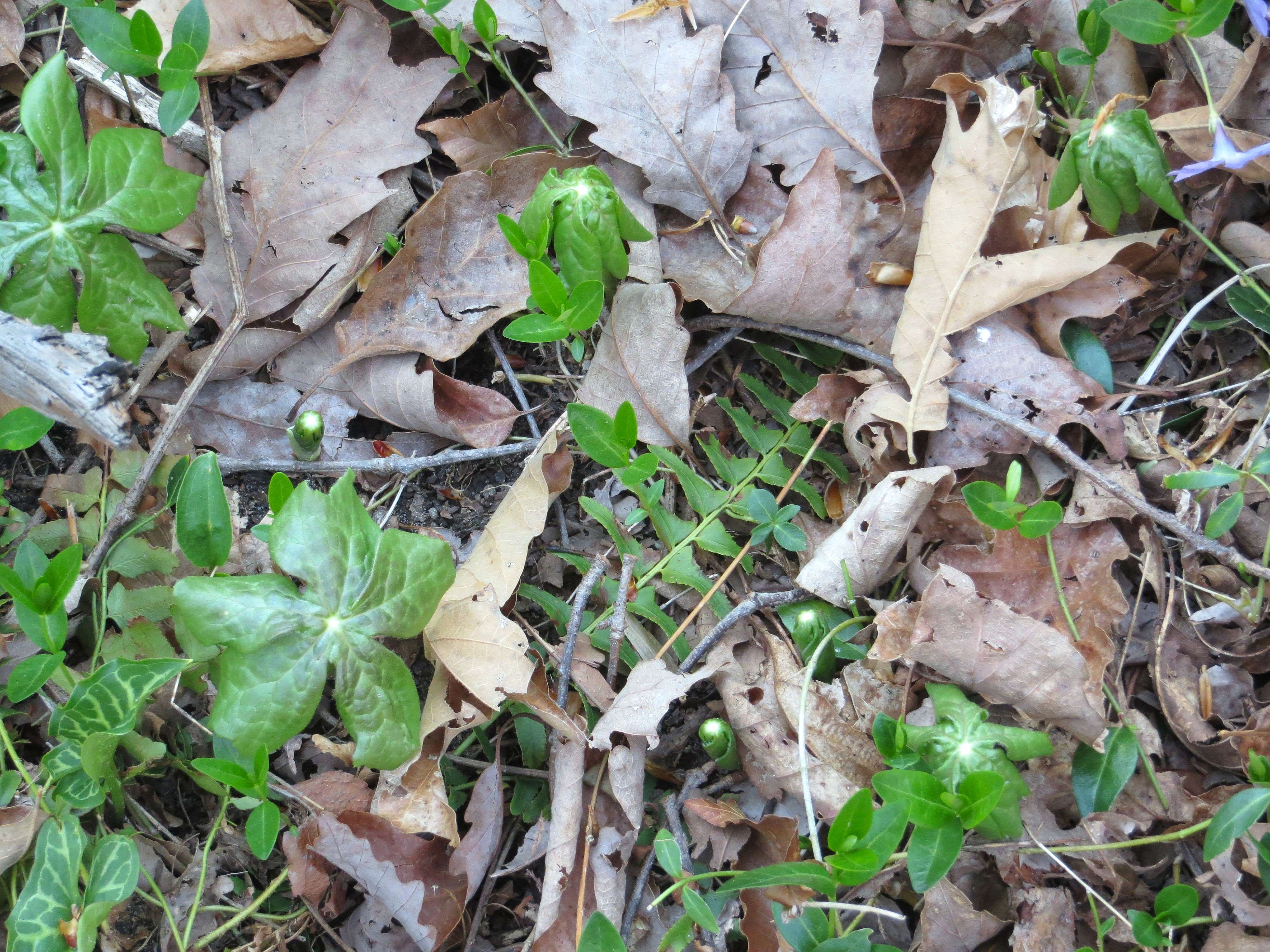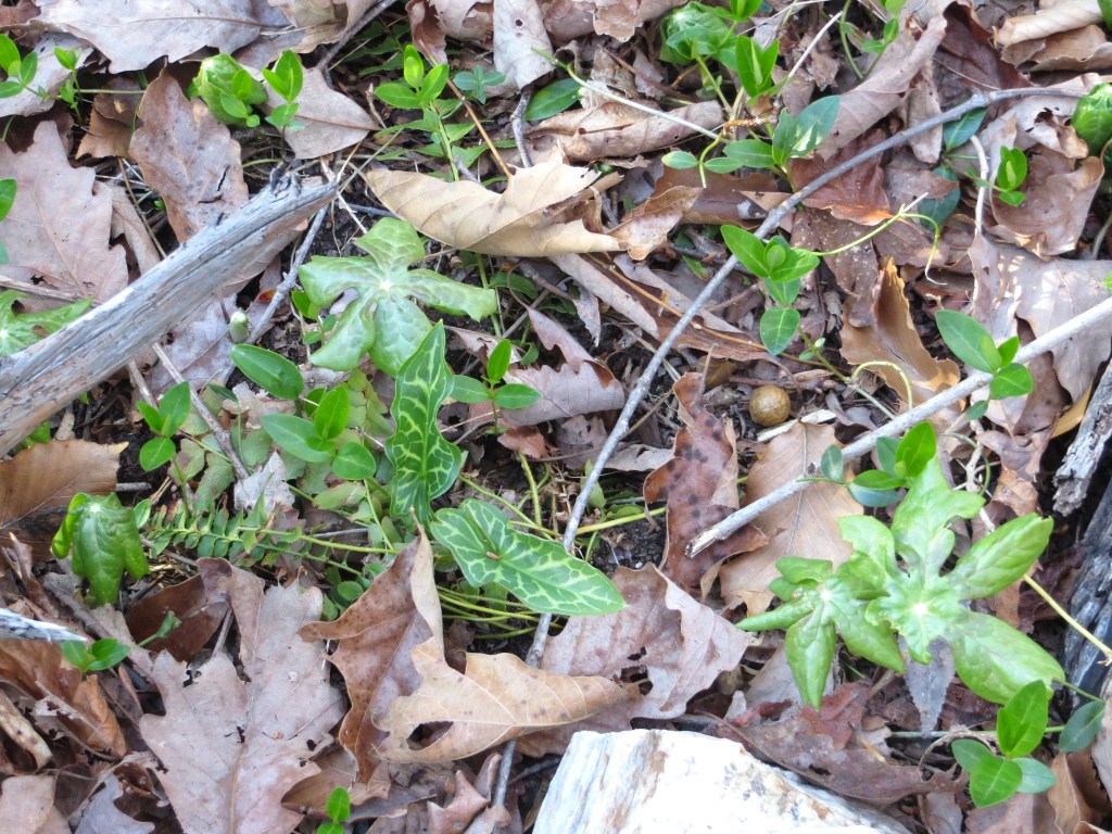 After writing on Wednesday about Podophyllum peltatum, or mayapple, which is the Virginia Native Plant Society’s Wildflower of the Year for 2025, I went in search of emerging mayapple leaves where they have grown here in previous years. And to my utter delight they are beginning to emerge from the leaf litter. They expand a bit each year to make an interesting patch along a path under an old oak tree. Utterly poisonous, no grazers disturb them. They require no fuss or care. I like how they look a bit mysterious and blend so well with spring bulbs, ferns, and ground cover vines.