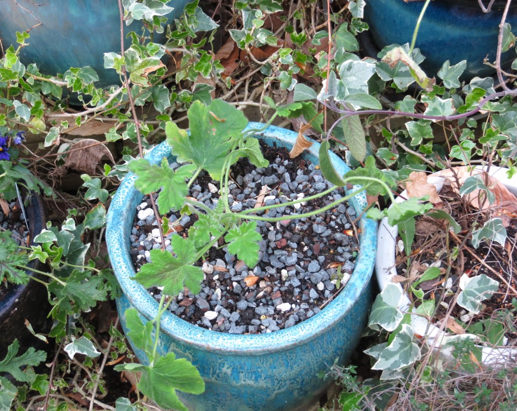 I am gambling on warming weather going forwards, planting out the scented geraniums along with a few zonal geraniums, some Verbena, and other herbs and ferns. It can be tricky looking at the remains of last year’s marginal perennials and herbs, and deciding whether there is enough life still in the roots to leave the crown in place with a good trim, or whether to replace it. And I’m always so happy to see new growth poking out of a woody stem. So I am in process of evaluating each container left out over winter, cleaning it up, adding a shake of fertilizer, and either pruning or replacing what grew there last season.