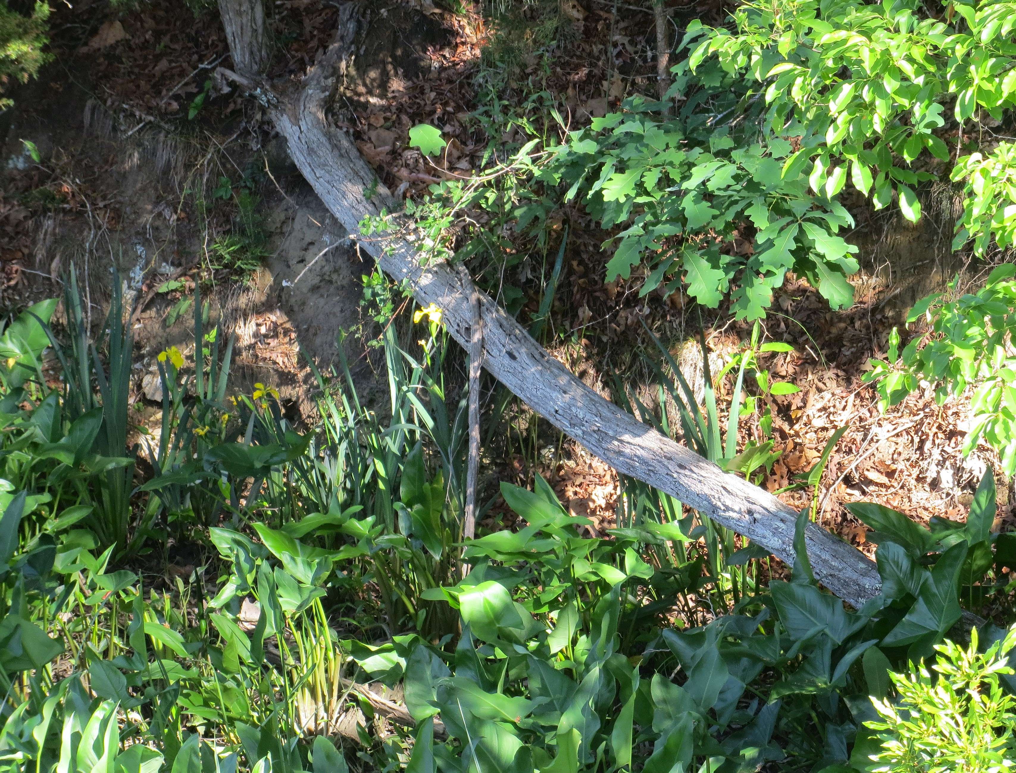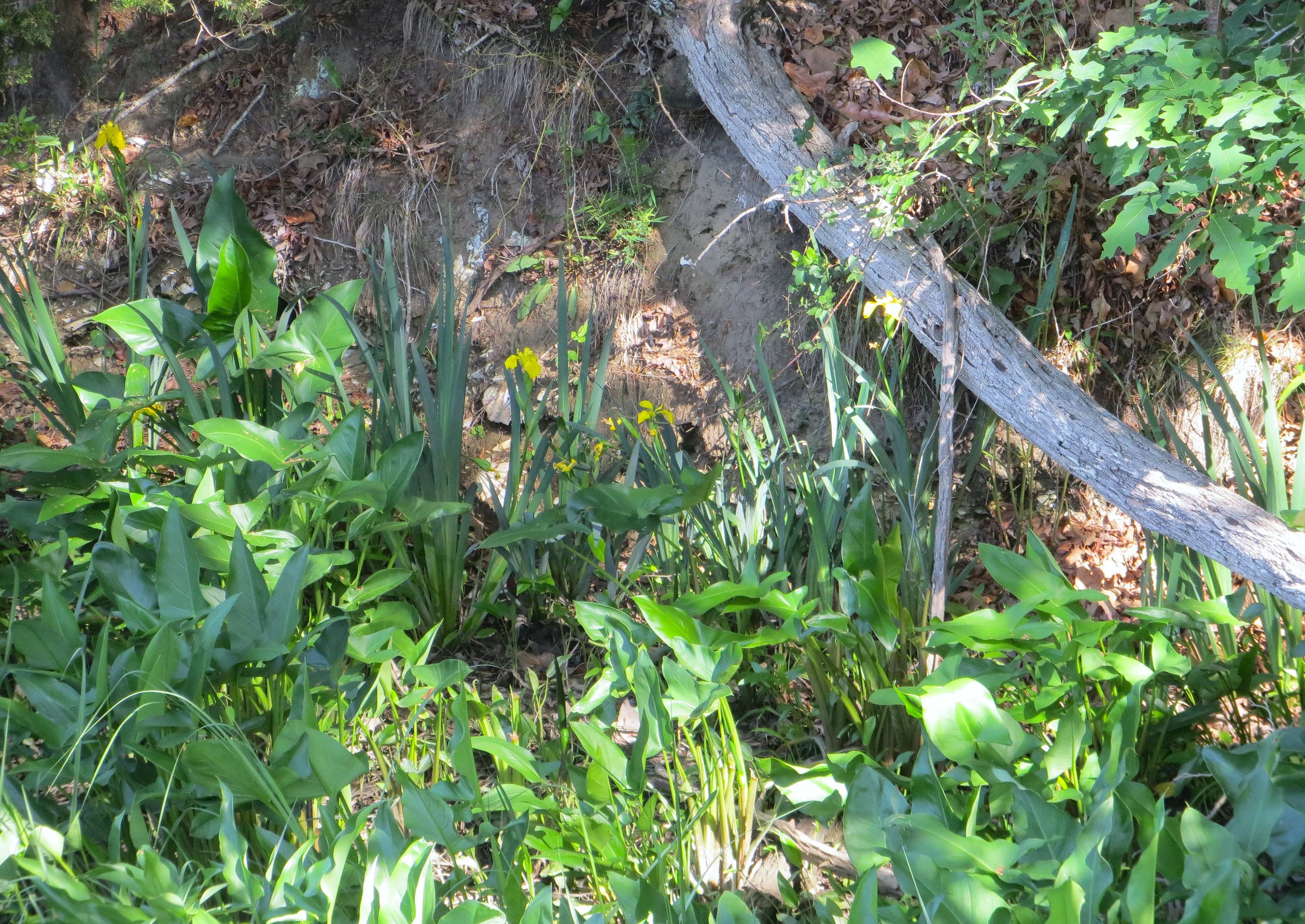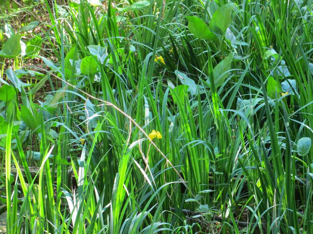 I was specifically searching for these naturalized Irises this morning and found them in a few different areas along our drive. They bloom for a few weeks in May each year and then their foliage stands until frost, performing a host of ecological services in wetlands. They hold ground against erosion, help to filter and purify local waterways, sequester carbon from the air, and provide habitat for a variety of insects, crustaceans, reptiles and birds. They grow with pickerelweed, Pontederia cordata, as seen here, and with cattails along our many creeks, lakes, and rivers.