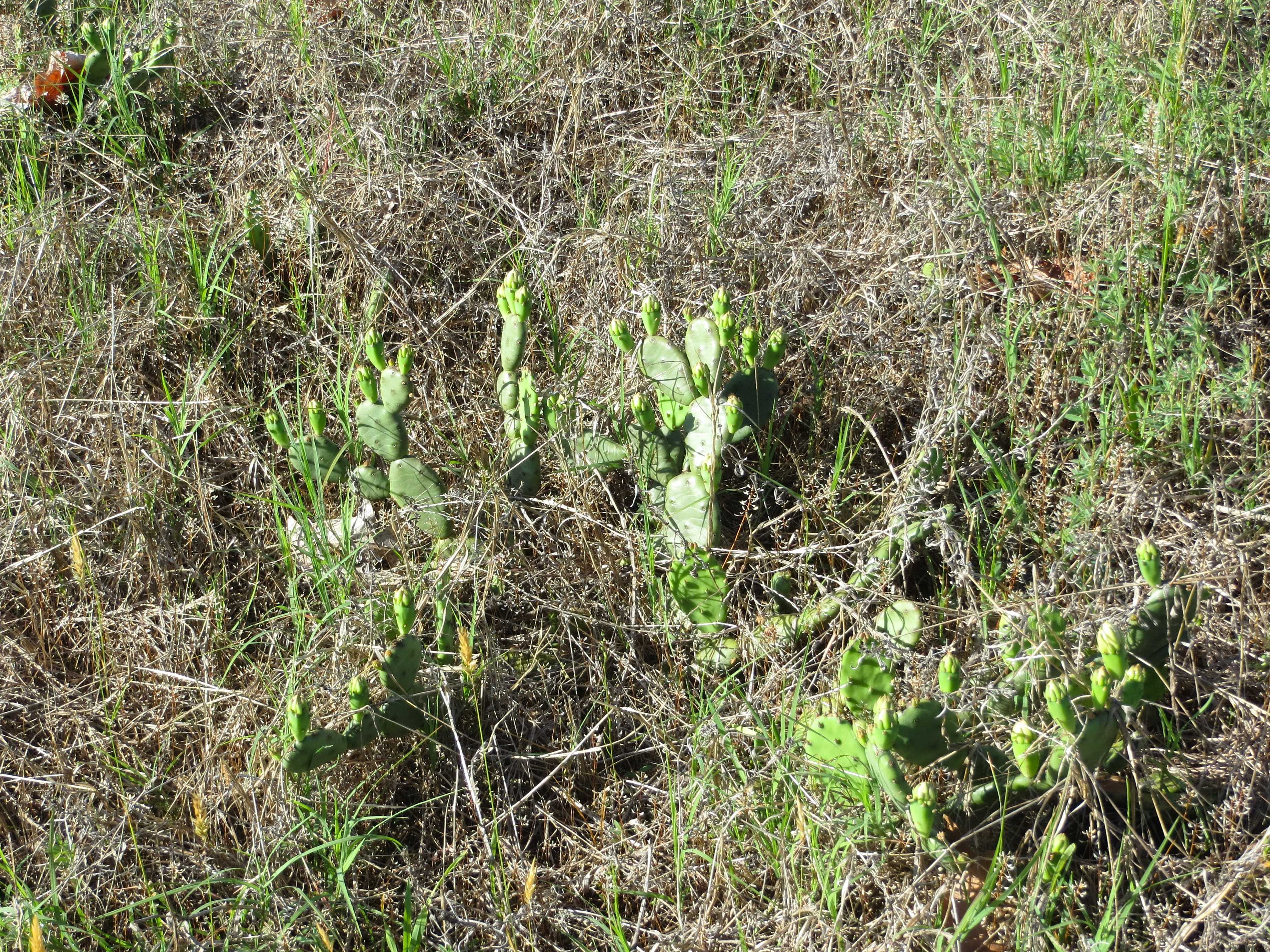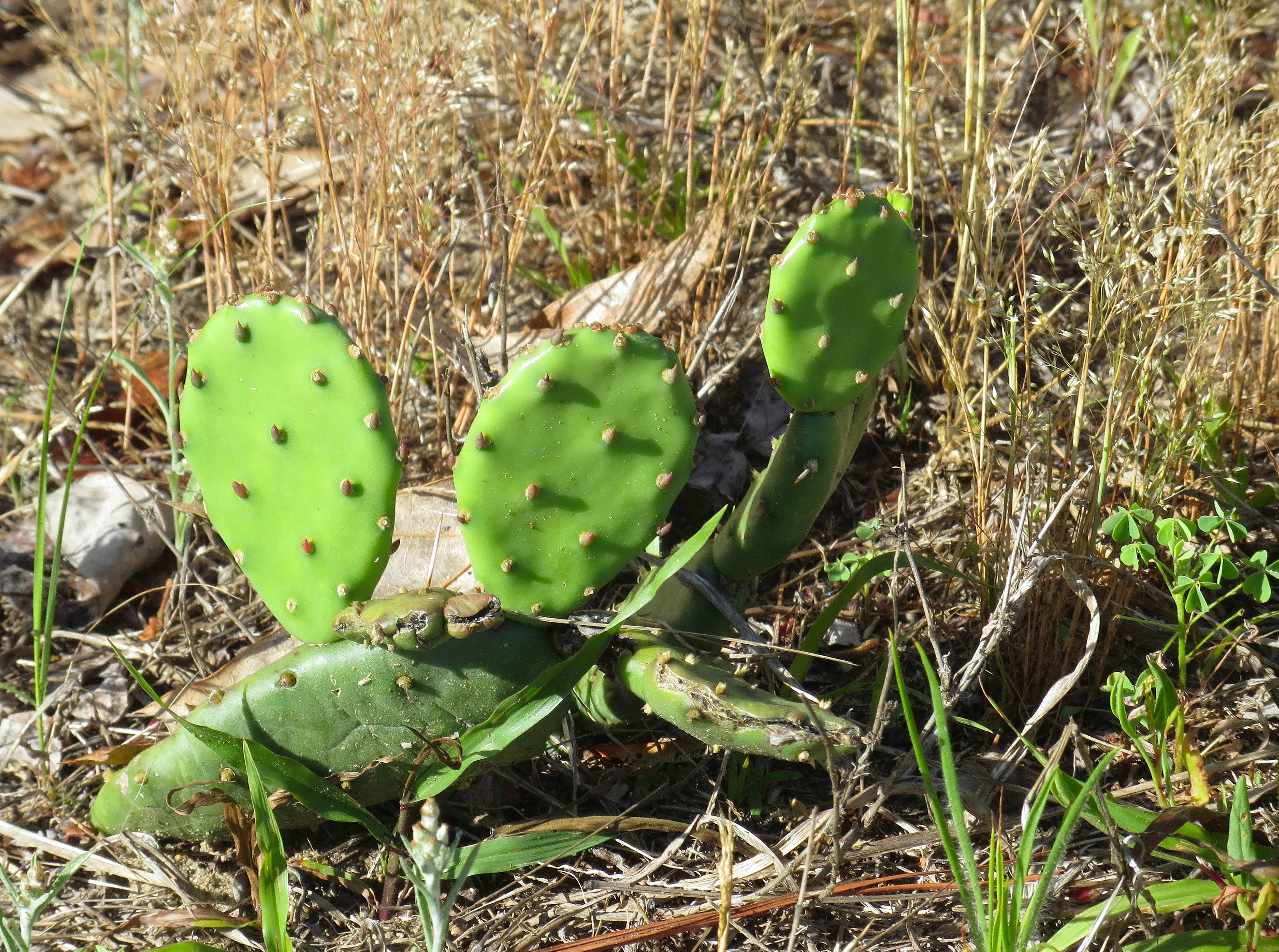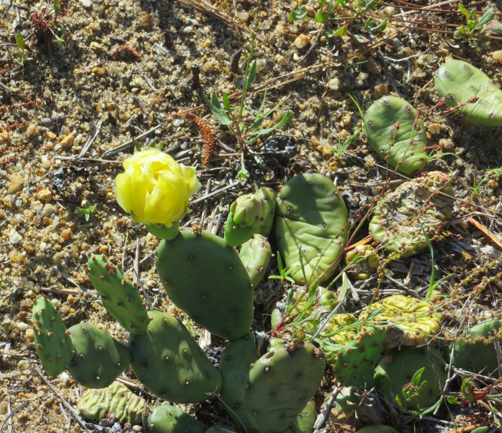 The sixth plant today is our native prickly-pear cactus, Opuntia drummondii. This grows in barren, weedy, gravelly stretches in full sun beside the James River. Its fruits, the red prickly-pears which will ripen in late summer, are edible raw or made into jelly. The green pads, a succulent leaf, also are edible. But beware because their spines are quite long and sharp!