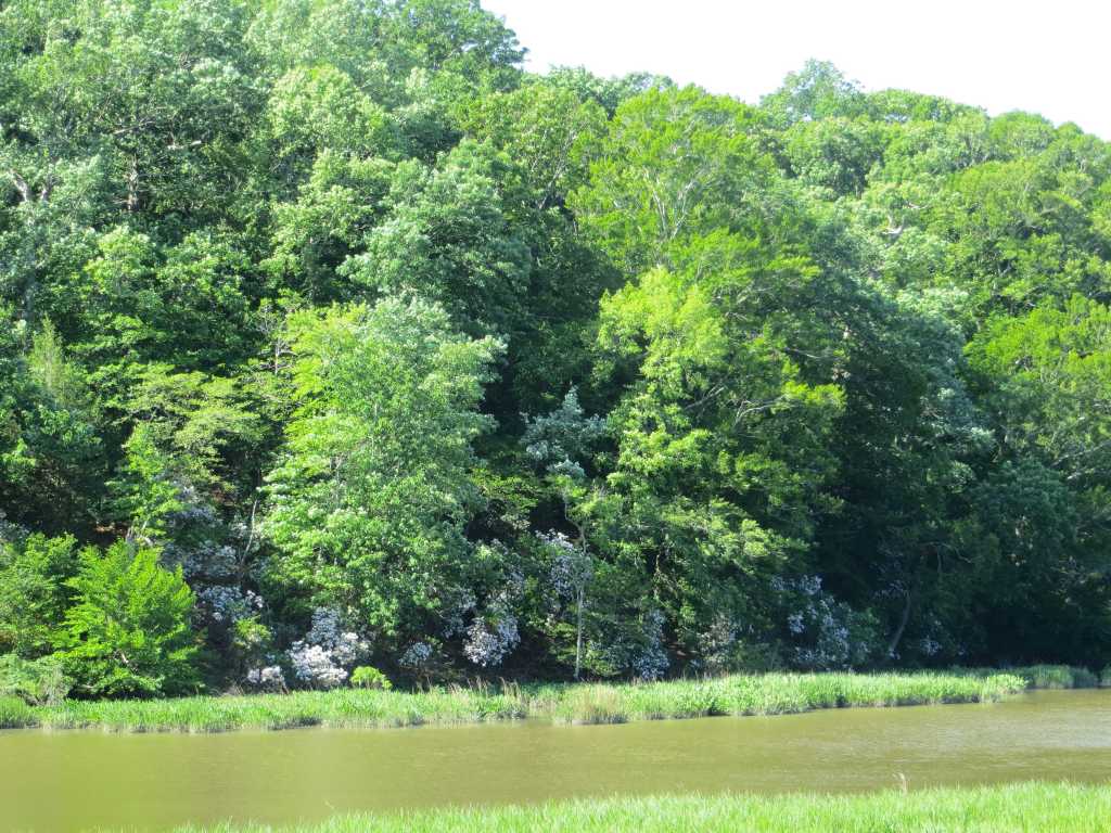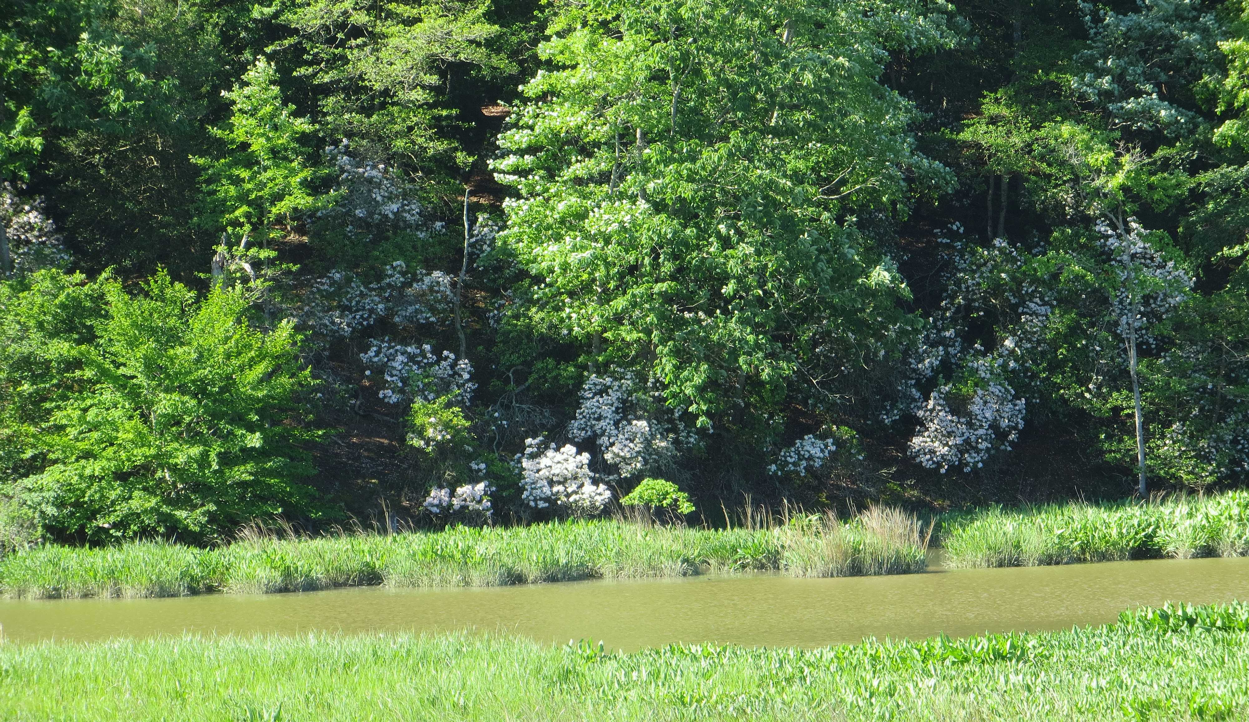 Mountain laurel shrubs, Kalmia latifolia, grow wild along the banks of Halfway Creek. They line the bank as far as one can see on either side of the bridge which crosses the creek. These are native shrubs which grow best when they grow wild. They can be difficult to transplant and are hard to purchase. They bloom in either soft pink or soft white. A shrub suited to acidic soils, they want sharp drainage and grow best on a slope, rather like Rhododendrons.