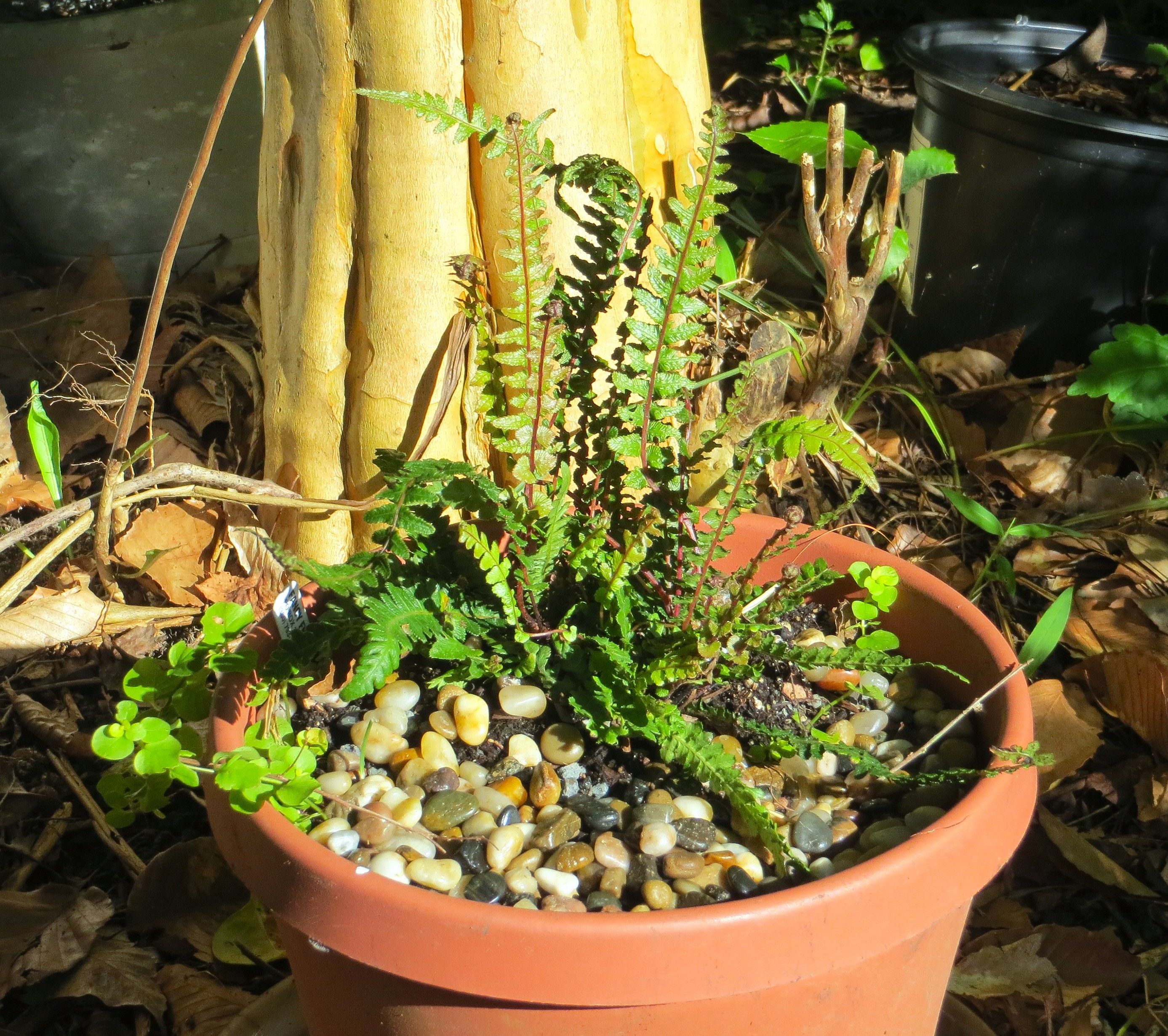 The lacy Victoria lady fern is probably also destined for a container where deer and voles won’t disturb it, even though it is hardy here. Of the several I’ve planted over the years, those in containers tend to grow better and longer. This is an English cultivar of A. filix-femina and so probably prefers a more northern climate than we can provide, particularly since Zone 8 is the southernmost area of its native range.