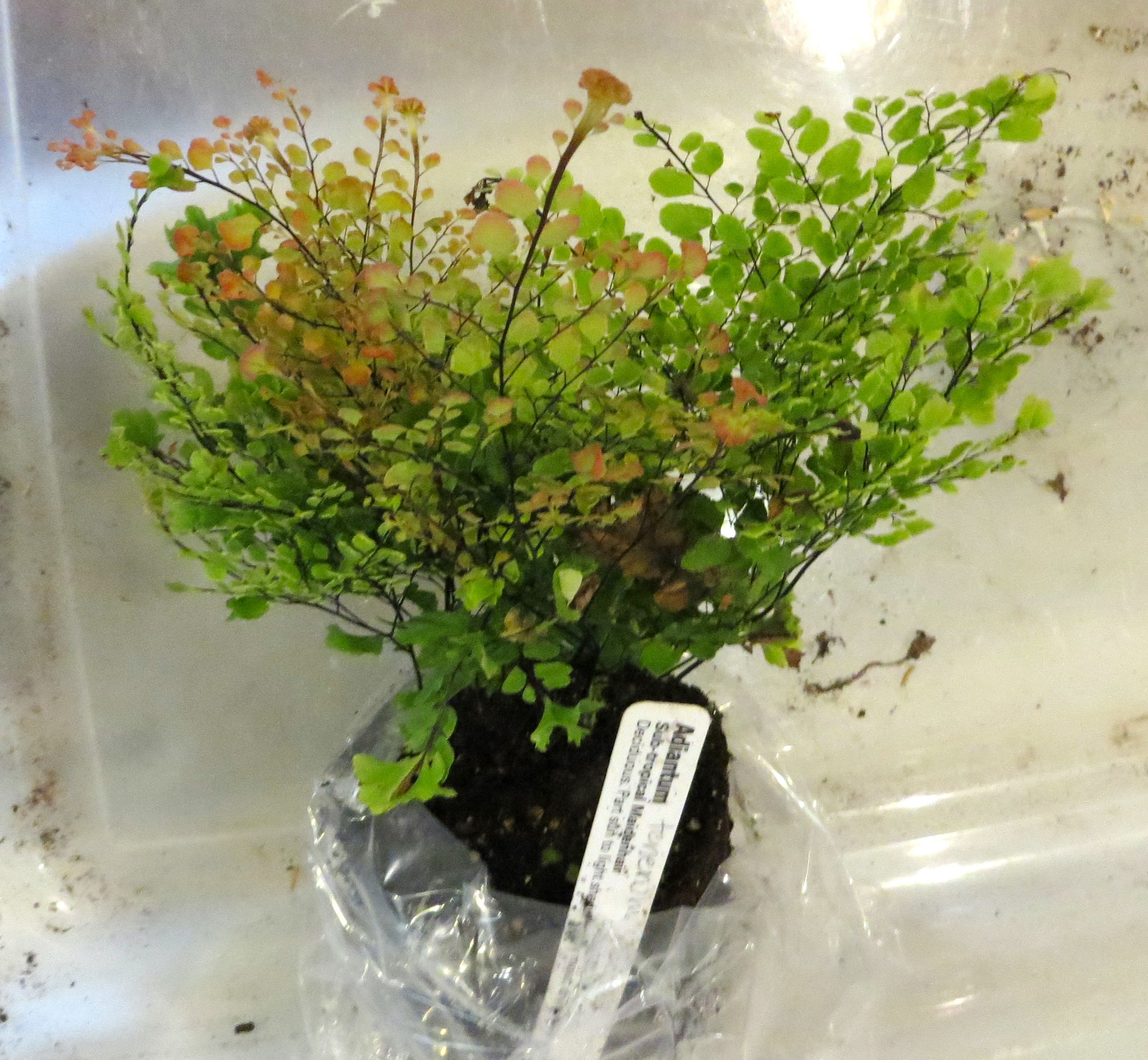 Three of these new ferns will eventually go into the ground to extend an existing border of Dryopteris erythrosora and Japanese painted fern cultivars. But it is likely wise to pot them first, and wait to plant them out until early fall. The other three are destined for containers, particularly since the Doodia is marginally hardy here. I also succumbed to plant lust and ordered a peacock maidenhair fern, Adiantum tenerum, native to Florida and tropical areas in the Americas. It has lovely, rose colored new foliage and a very lacy texture. But it will want to come indoors when the Caladiums finish in late October.