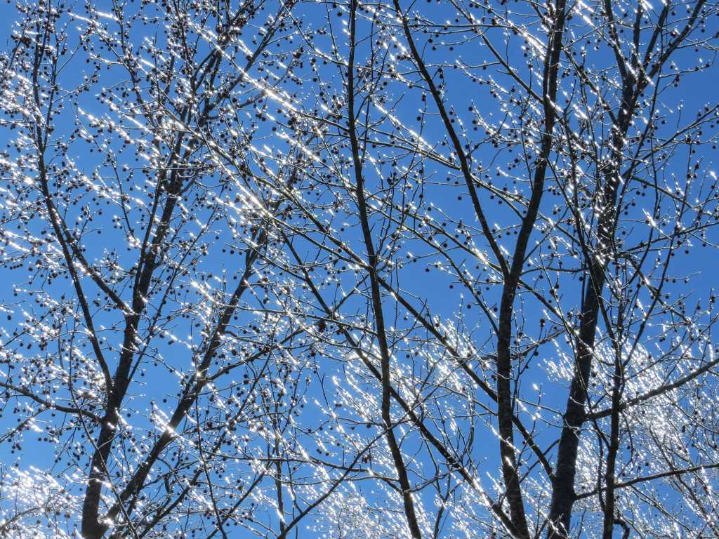 It snowed again last night. It began in late afternoon and snowed off and on through the night, finishing as the sun rose this morning. It is clinging to the leaves of evergreens and still balancing elegantly on bare branches despite the gusty winds and bright sunshine this morning. It is one of those days when the high temperature for the day was clocked before sunrise. I’m listening to the wind roar from the northwest as I type.