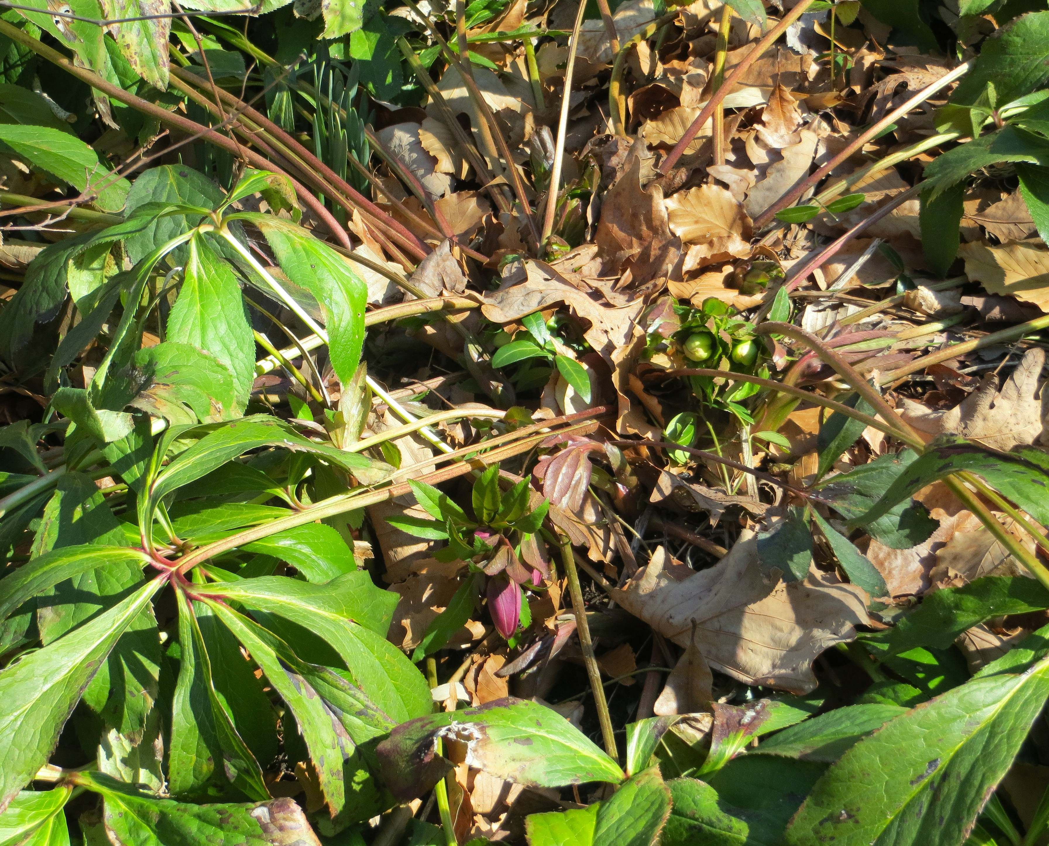 Even our hellebores seem late to bloom this winter. Those that were showing signs of blooming a few weeks ago were set back by the ice storm. While I trimmed back ratty leaves in December, I haven’t been back around to get those damaged in this latest cold. And so they remain as a living, though perhaps unattractive mulch as we finally see buds emerging this month.